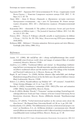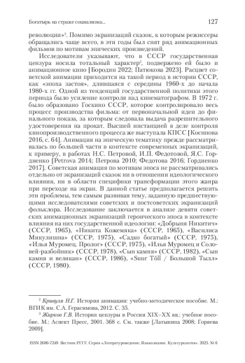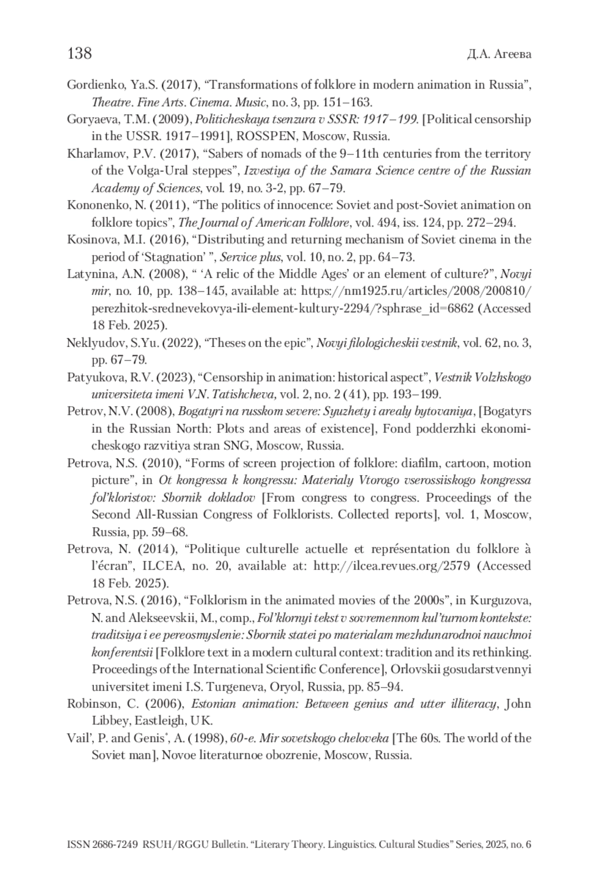 АГЕЕВА Д. А. БОГАТЫРЬ НА СТРАЖЕ СОЦИАЛИЗМА: ВЛИЯНИЕ ГОСУДАРСТВЕННОЙ ИДЕОЛОГИИ НА АНИМАЦИОННЫЕ ЭКРАНИЗАЦИИ ЭПИЧЕСКОГО ФОЛЬКЛОРА В СССР // ВЕСТНИК РГГУ. СЕРИЯ «ЛИТЕРАТУРОВЕДЕНИЕ. ЯЗЫКОЗНАНИЕ. КУЛЬТУРОЛОГИЯ». 2025. № 6