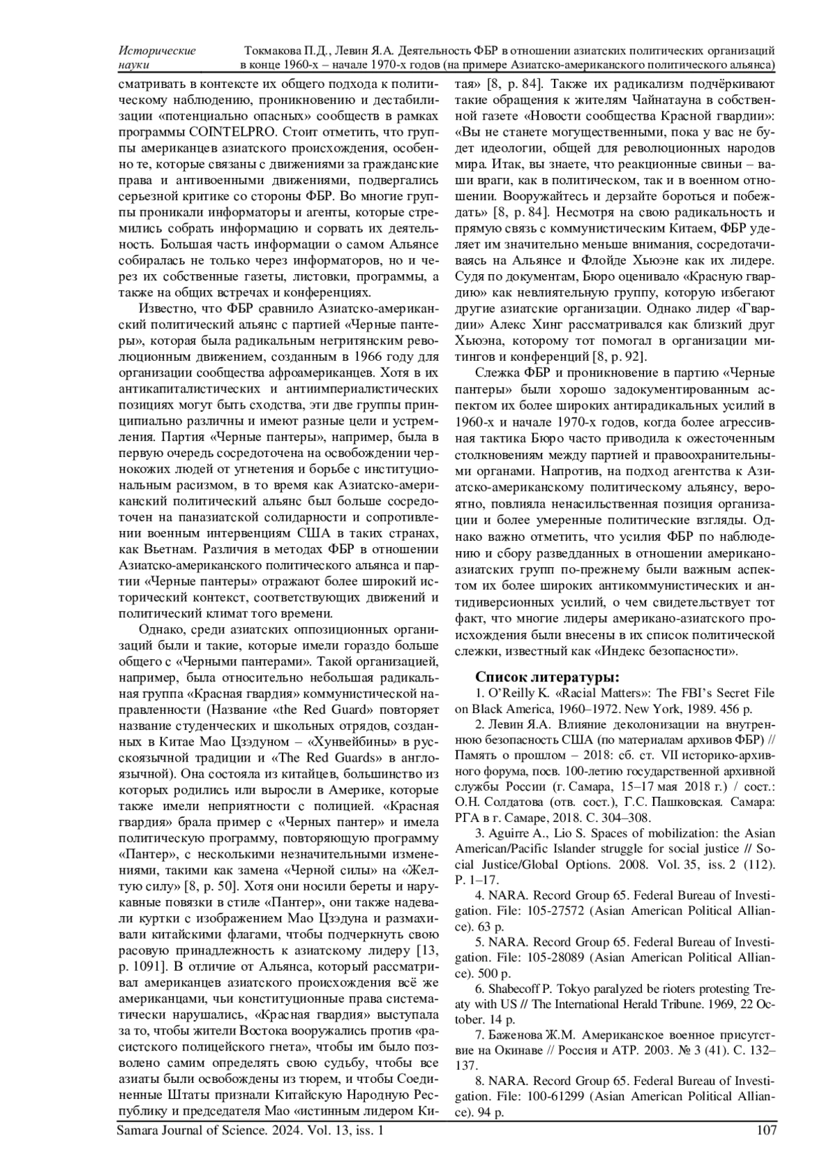 ТОКМАКОВА П. Д., ЛЕВИН Я. А. ДЕЯТЕЛЬНОСТЬ ФБР В ОТНОШЕНИИ АЗИАТСКИХ ПОЛИТИЧЕСКИХ ОРГАНИЗАЦИЙ В КОНЦЕ 1960-Х - НАЧАЛЕ 1970-Х ГОДОВ (НА ПРИМЕРЕ АЗИАТСКО-АМЕРИКАНСКОГО ПОЛИТИЧЕСКОГО АЛЬЯНСА) // САМАРСКИЙ НАУЧНЫЙ ВЕСТНИК. 2024. ТОМ 13, № 1