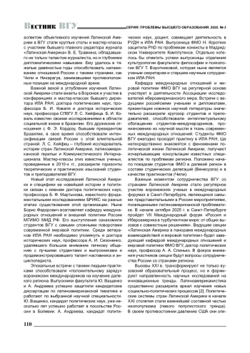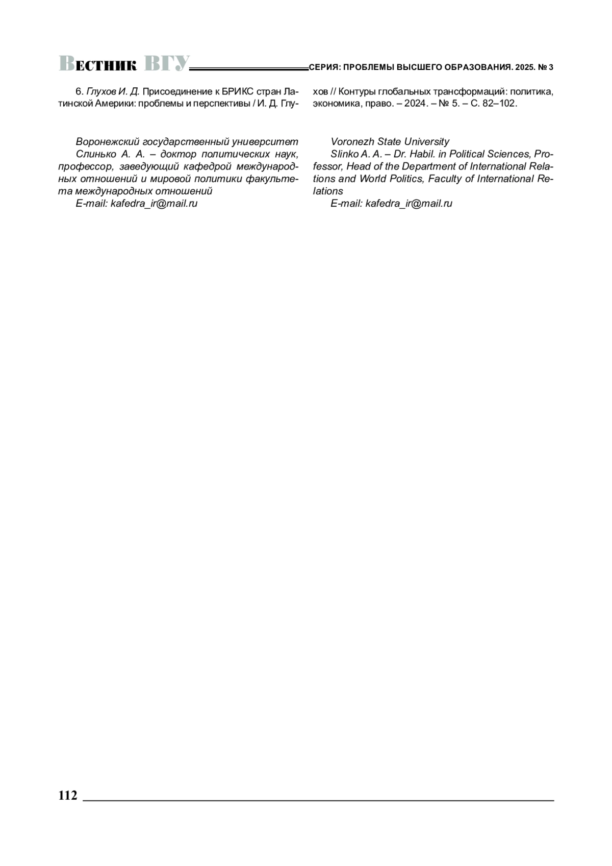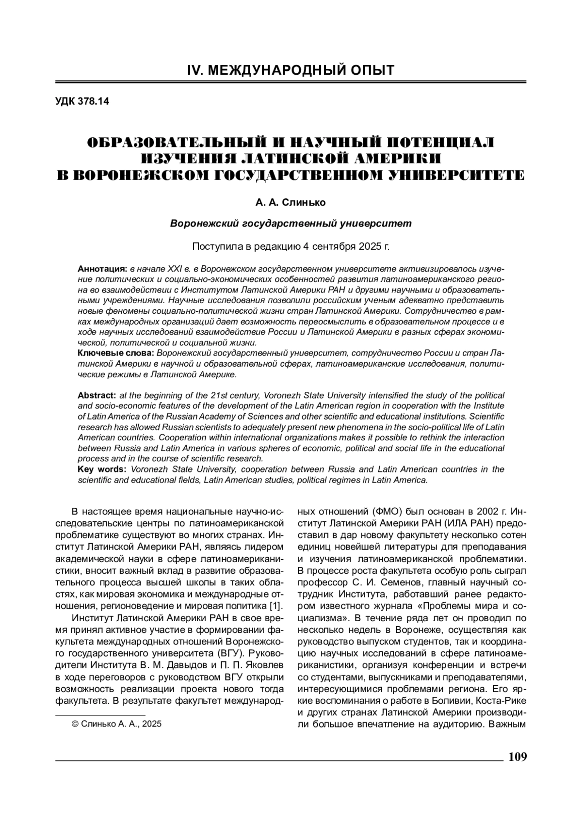 СЛИНЬКО А. А. ОБРАЗОВАТЕЛЬНЫЙ И НАУЧНЫЙ ПОТЕНЦИАЛ ИЗУЧЕНИЯ ЛАТИНСКОЙ АМЕРИКИ В ВОРОНЕЖСКОМ ГОСУДАРСТВЕННОМ УНИВЕРСИТЕТЕ // ВЕСТНИК ВОРОНЕЖСКОГО ГОСУДАРСТВЕННОГО УНИВЕРСИТЕТА. СЕРИЯ: ПРОБЛЕМЫ ВЫСШЕГО ОБРАЗОВАНИЯ. 2025. № 3