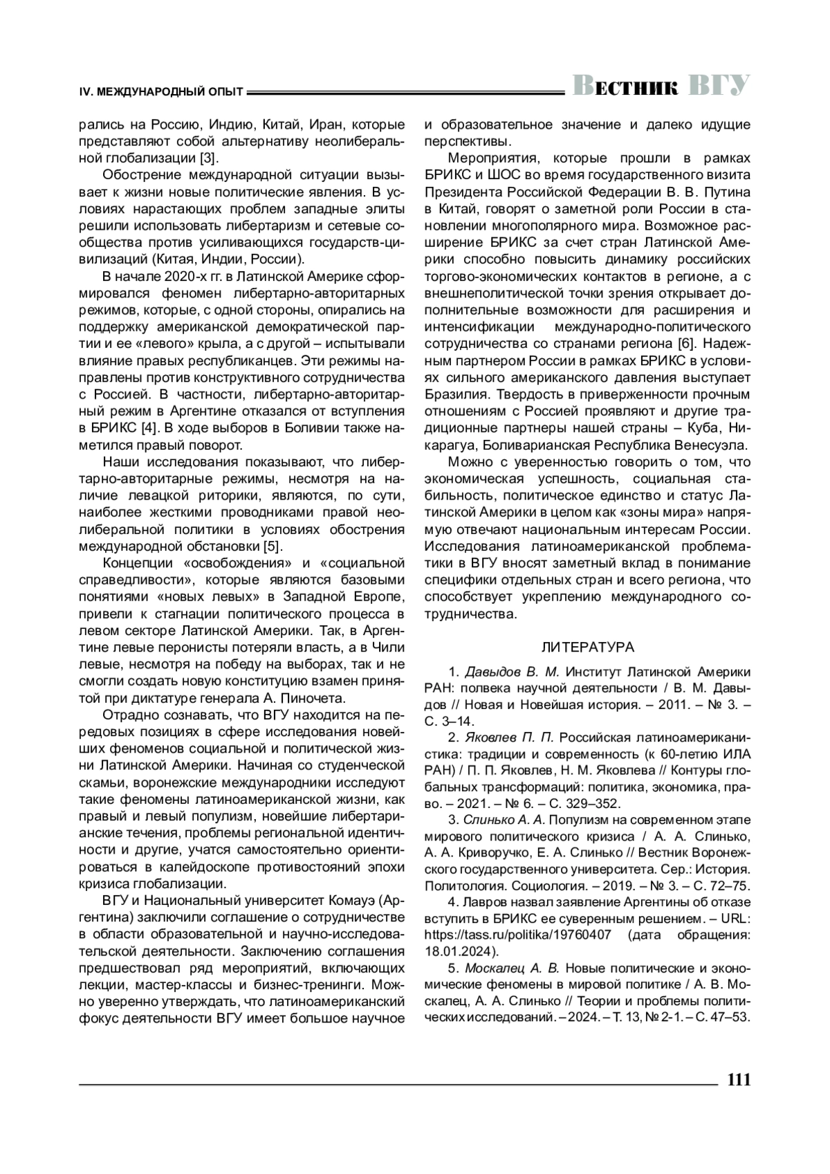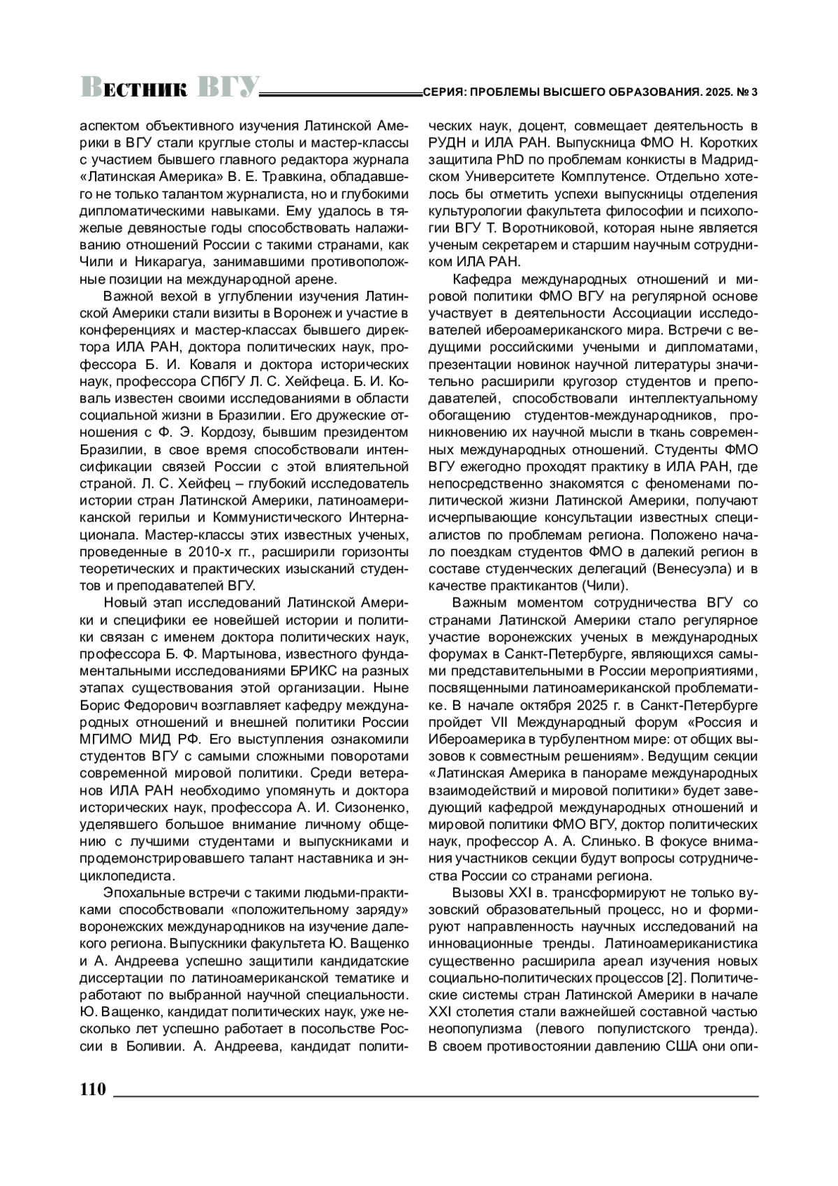 Статья: ОБРАЗОВАТЕЛЬНЫЙ И НАУЧНЫЙ ПОТЕНЦИАЛ ИЗУЧЕНИЯ ЛАТИНСКОЙ АМЕРИКИ В ВОРОНЕЖСКОМ ГОСУДАРСТВЕННОМ УНИВЕРСИТЕТЕ (2025)
