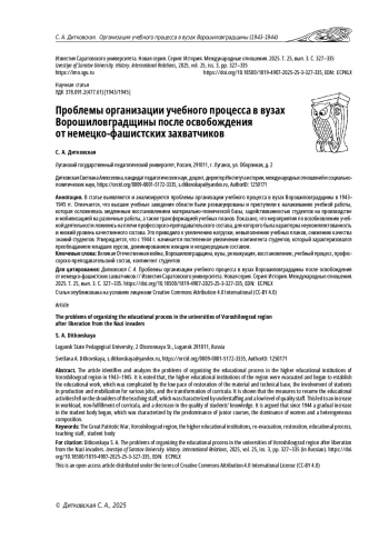 В статье выявляются и анализируются проблемы организации учебного процесса в вузах Ворошиловградщины в 1943–1945 гг. Отмечается, что высшие учебные заведения области были реэвакуированы и приступили к налаживанию учебной работы, которая осложнялась медленным восстановлением материально-технической базы, задействованностью студентов на производстве и мобилизацией на различные работы, а также трансформацией учебных планов. Показано, что мероприятия по возобновлению учебной деятельности ложились на плечи профессорско-преподавательского состава, для которого была характерна неукомплектованность и низкий уровень качественного состава. Это приводило к увеличению нагрузки, невыполнению учебных планов, снижению качества знаний студентов. Утверждается, что с 1944 г. начинается постепенное увеличение контингента студентов, который характеризовался преобладанием младших курсов, доминированием женщин и неоднородным составом.