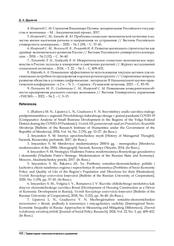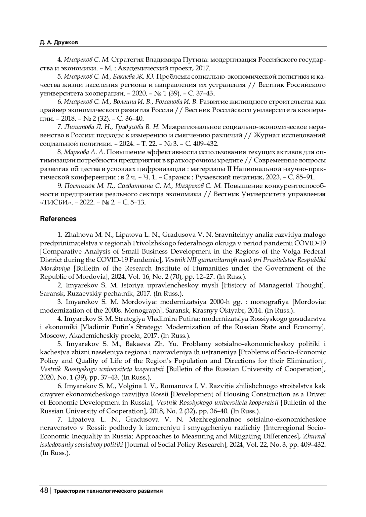 1. Жалнова М. Н., Липатова Л. Н., Градусова В. Н. Сравнительный анализ развития малого предпринимательства в регионах Приволжского федерального округа в период пандемии COVID-19 // Вестник НИИ гуманитарных наук при Правительстве Республики Мордовия. - 2024. - Т. 16. - № 2 (70). - С. 12-27. EDN: CUDHYU