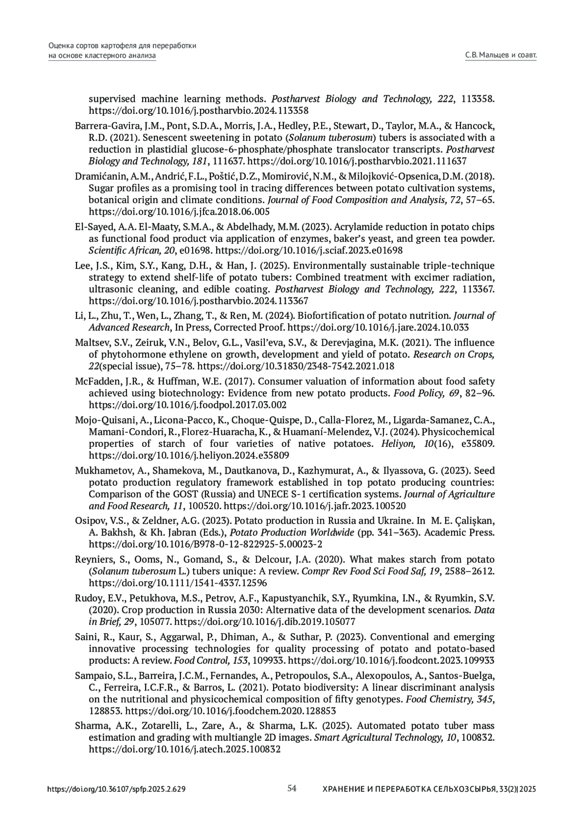 1. Зейрук, В.Н., Мальцев, С.В., Васильева, С.В., & Бызов, В.А. (2019). Современные производственные факторы, определяющие биологическую и экономическую эффективность хранения картофеля. Хранение и переработка сельхозсырья, 3, 20-28. DOI: 10.36107/spfp.2019.177