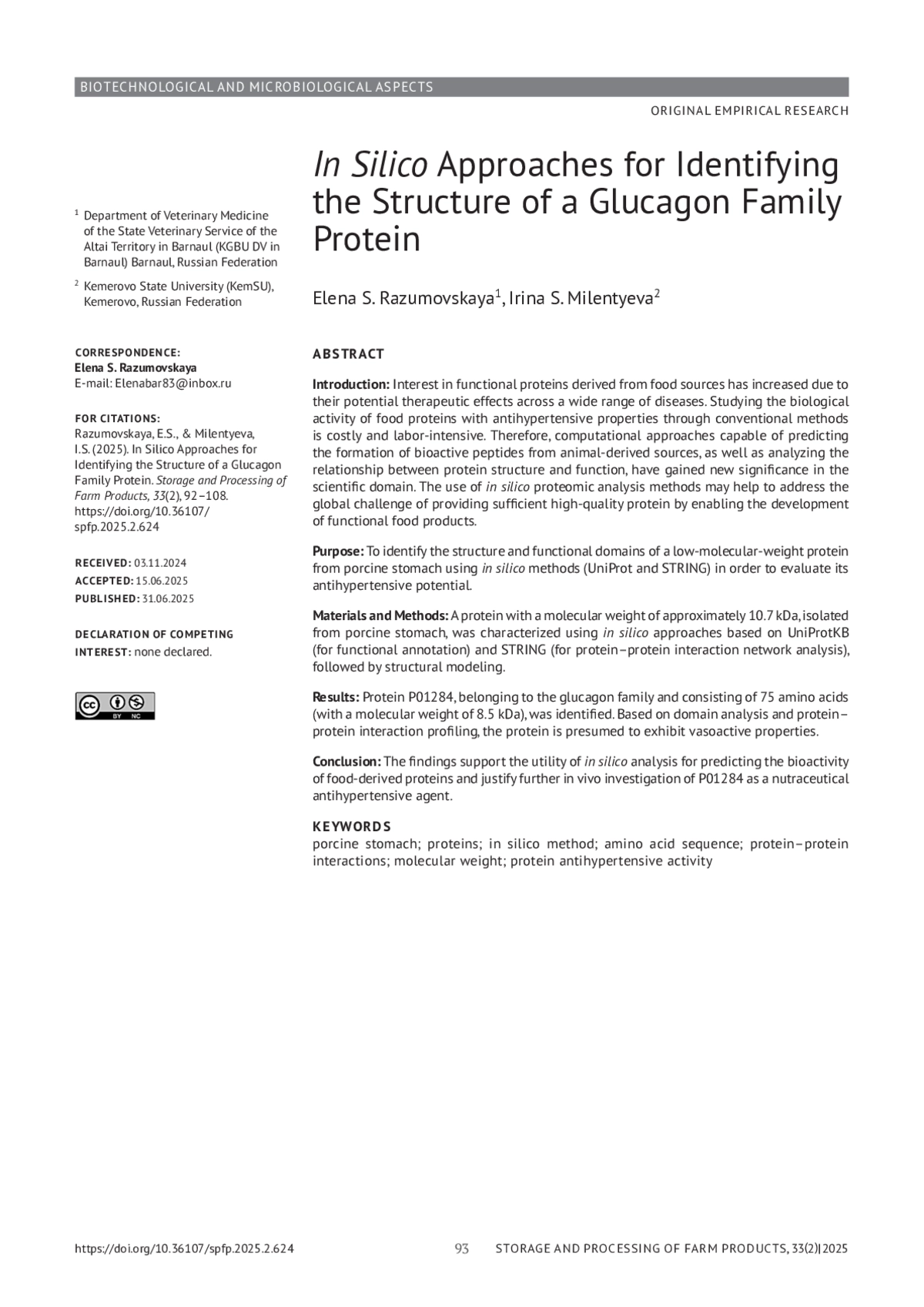 Выводы: Результаты подтверждают целесообразность использования in silico анализа для прогнозирования биоактивности пищевых белков и обосновывают дальнейшие in vivo исследования P01284 как антигипертензивного агента нутрицевтического профиля.