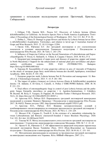 2. Delbac L., Thiery D. Damage to grape flowers and berries by Lobesia botrana larvae (Denis &Schiffernüller) (Lepidoptera: Tortricidae), and relation to larval age // Australian Journal of Grape and Wine Research. 2015. 22. DOI: 10.1111/ajgw.12204