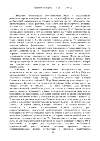 Возможности восстановления роста и плодоношения различных сортов винограда зависят от их ампелографических характеристик, особенностей выращивания и степени воздействия на них неблагоприятных климатических и иных факторов. Чаще всего они провоцируются влиянием экстремально низких зимних температур, являющихся лимитирующим условием для возделывания неукрывных виноградников [1–4]. При поражении виноградных растений в силу различных причин все усилия направляются на восстановление их роста и плодоношения за счет имеющихся глубинных биологических резервов – оставшихся живых зимних и угловых глазков, а также спящих почек [5, 6]. По мнению Тодорова, Анькова [7], замещающие почки зимних глазков и угловых глазков сорта Памид, выращиваемого на высокоштамбовых формировках, можно использовать не только для восстановления роста, но и для получения определенного урожая винограда. По данным Cartechini et al., [8] восстановление роста и плодоношения после морозных повреждений винных сортов винограда зависит от количества замещающих почек, развившихся на зимних глазках. После воздействия стрессовых факторов на хозяйственно важные десертные и винные сорта винограда характер их восстановительного потенциала представляет интерес для практического виноградарства, что и является целью данного исследования.