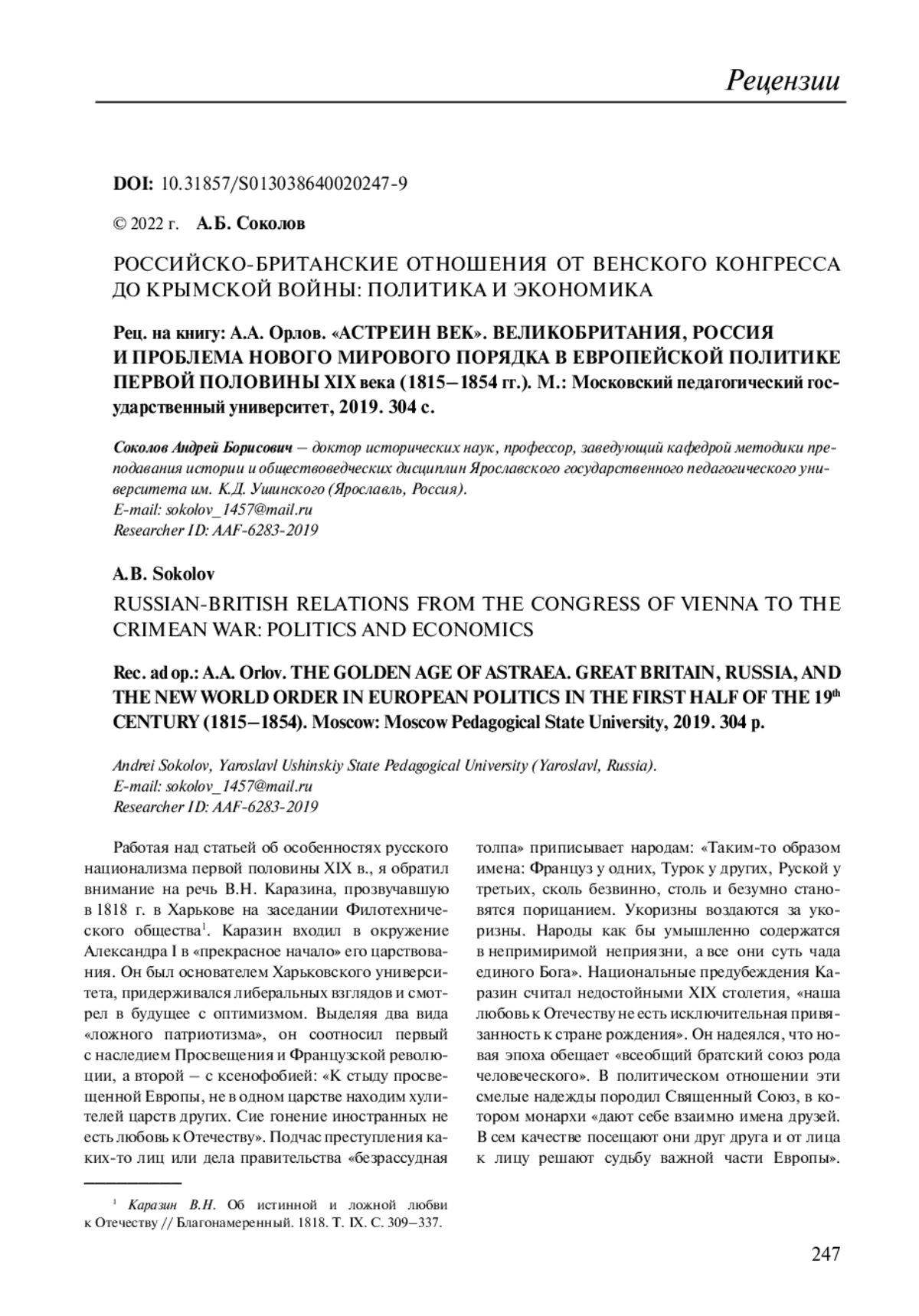 Статья: РОССИЙСКО-БРИТАНСКИЕ ОТНОШЕНИЯ ОТ ВЕНСКОГО КОНГРЕССА ДО КРЫМСКОЙ ВОЙНЫ: ПОЛИТИКА И ЭКОНОМИКА (А. А. ОРЛОВ. "АСТРЕИН ВЕК". ВЕЛИКОБРИТАНИЯ, РОССИЯ И ПРОБЛЕМА НОВОГО МИРОВОГО ПОРЯДКА В ЕВРОПЕЙСКОЙ ПОЛИТИКЕ ПЕРВОЙ ПОЛОВИНЫ XIX ВЕКА (1815-1854 ГГ.). М., 2019) (2022)