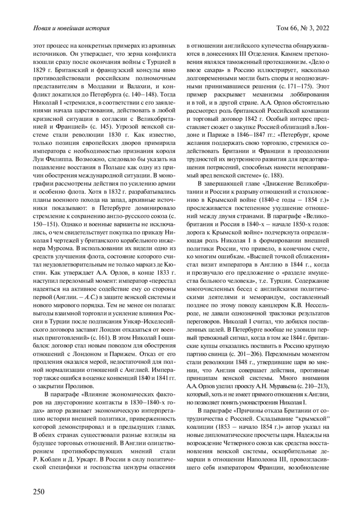 СОКОЛОВ А. Б. РОССИЙСКО-БРИТАНСКИЕ ОТНОШЕНИЯ ОТ ВЕНСКОГО КОНГРЕССА ДО КРЫМСКОЙ ВОЙНЫ: ПОЛИТИКА И ЭКОНОМИКА (А. А. ОРЛОВ. "АСТРЕИН ВЕК". ВЕЛИКОБРИТАНИЯ, РОССИЯ И ПРОБЛЕМА НОВОГО МИРОВОГО ПОРЯДКА В ЕВРОПЕЙСКОЙ ПОЛИТИКЕ ПЕРВОЙ ПОЛОВИНЫ XIX ВЕКА (1815-1854 ГГ.). М., 2019) // НОВАЯ И НОВЕЙШАЯ ИСТОРИЯ. 2022. № 3