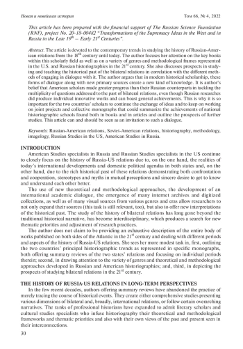 Статья посвящена современным тенденциям в изучении истории российскоамериканских отношений с конца XVIII в. до начала XXI в. Автор видит свою задачу в том, чтобы представить основные монографические исследования по данной проблематике, обратить внимание на многообразие жанров и теоретико-методологических подходов, получивших развитие в российской и американской историографии, а также обозначить перспективы изучения и преподавания истории двусторонних отношений. Его внимание сосредоточено на характеристике различных способов вопрошания исторического прошлого, поскольку в современной исторической науке от этого, а не только от введения в научный оборот ранее не использованных архивных источников, зависит получение новых знаний. По мнению автора, в многообразии вопросов, адресованных прошлому, американские историки преуспели в большей степени, чем их российские коллеги по цеху, несмотря на общие достижения и отдельные новаторские работы последних. Поэтому так важен откровенный разговор между учеными двух стран и продолжение работы в рамках совместных проектов и коллективных монографий, где можно было бы обобщить достижения национальных историографических школ не только на уровне монографической, но и статейной литературы и наметить перспективы дальнейших исследований. Данная статья может и должна рассматриваться как приглашение к такому разговору