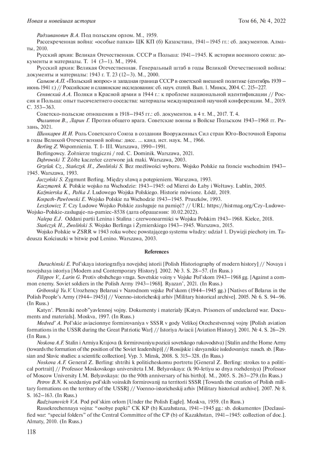 6. Зданович А.А. “Польская воинская часть… высоко поднимет вес и авторитет поляков в ходе войны и в становлении послевоенной Европы”. Рождение Войска польского (1942-1944 гг.) // Военно-исторический журнал. 2011. № 2. С. 48-54. EDN: NDLSLX