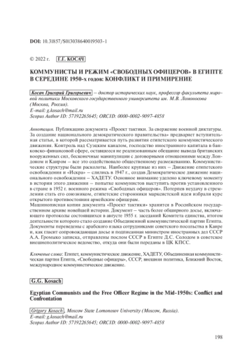КОСАЧ Г. Г. КОММУНИСТЫ И РЕЖИМ "СВОБОДНЫХ ОФИЦЕРОВ" В ЕГИПТЕ В СЕРЕДИНЕ 1950-Х ГОДОВ: КОНФЛИКТ И ПРИМИРЕНИЕ (№ 4-5) // НОВАЯ И НОВЕЙШАЯ ИСТОРИЯ. 2022. № 4