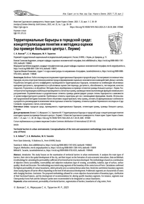 Введение. Работа посвящена исследованию территориальных барьеров в городской среде. Рассматриваются основные типы барьеров, их роль в пространственном развитии города и формировании социально-экономических взаимодействий. Данные и методы. Разработана методика расчета коэффициента проницаемости территориальных барьеров, основанная на комбинации объективных критериев (доступность, преодолимость) и субъективных оценок (тип перехода, доступность, обособленность, тип покрытия, качество покрытия). Результаты и их обсуждение. Методика была апробирована на примере сегментов границы большого центра г. Перми. Расчетным путем подтверждена наибольшая проницаемость контактных границ, преимущественно выполняющих функцию номинального разграничения. Ограничительные и разделительные сегменты границы демонстрируют разную степень барьерности в зависимости от уровня инфраструктурного развития. Проблемные сегменты характерны для зон с меняющимися функциями.