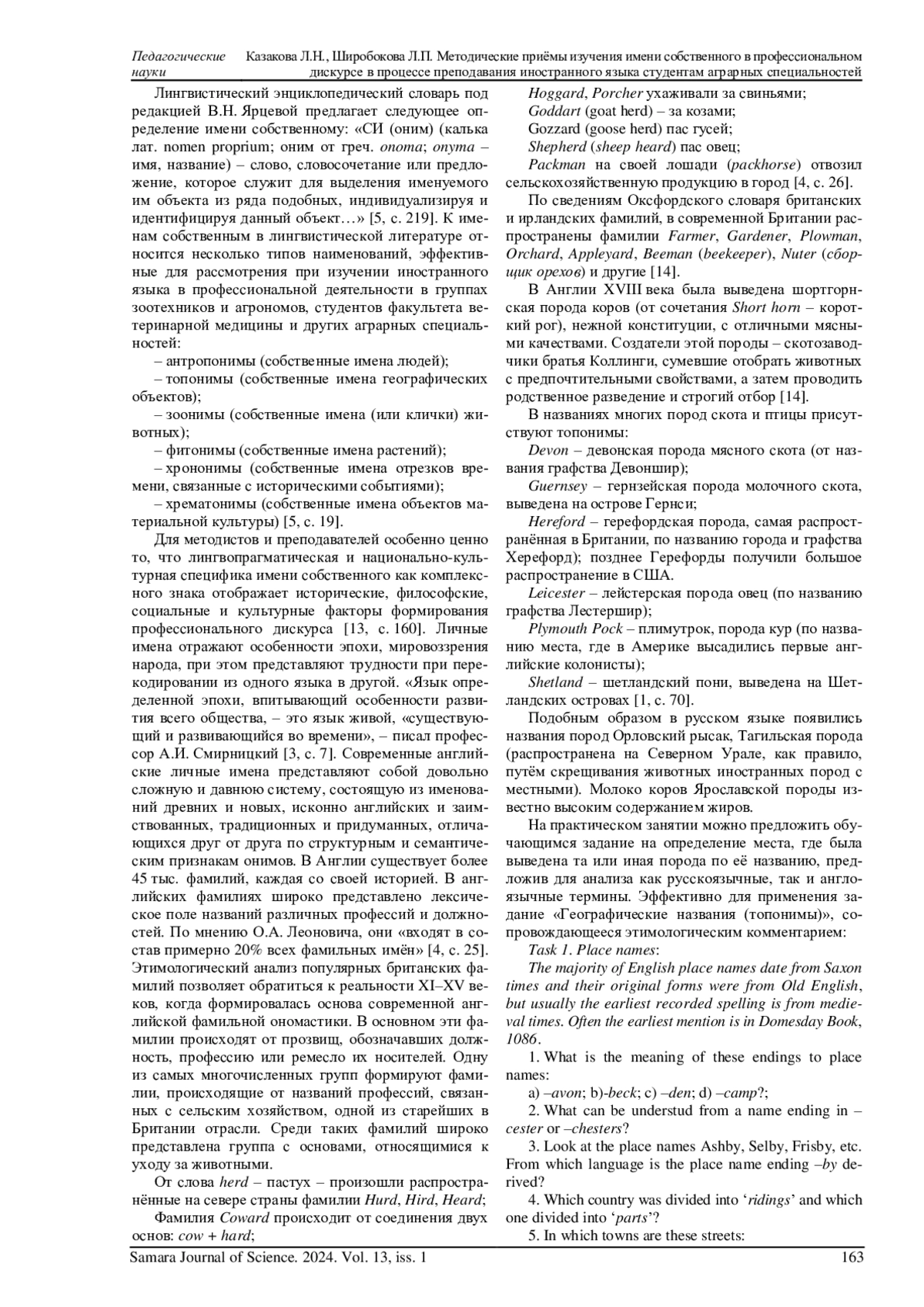 В статье рассматривается эффективность изучения имен собственных при обучении профессиональному иностранному языку English for Specific Purposes (ESP), ориентированному на профессиональную подготовку аграриев разных профилей. В современных рабочих программах аграрных университетов практически не уделяется внимание изучению имени собственного, которое занимает существенное место в составе лексики любого языка, отражая важные аспекты развития истории и культуры. Формирование ономастики как специфической отрасли языкознания, достижения региональной ономастики определяют актуальный для преподавателей иностранного языка аграрного университета источник информации. Изучение памятников письменности и культуры, данных этимологических словарей, краеведческой литературы, исследование групп зоонимов, топонимов и антропонимов вызывает необходимость разработки и применения новых методических приёмов и технологий. Все вышесказанное обусловливает актуальность темы данной статьи и определяет её цели: рассмотреть возможности использования собственных имён при изучении иностранного языка в профессиональной деятельности, представить эффективные методические приёмы, способствующие развитию профессиональных компетенций. При подготовке статьи применены следующие методы научного анализа и обобщения: описательный, методики этимологического анализа, а также элементы компаративного и типологического анализа.