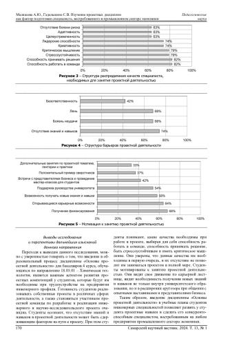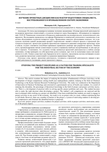 В статье рассматривается влияние изучения дисциплины «Основы проектной деятельности» на развитие проектных компетенций у студентов четвертого курса бакалавриата, обучающихся по направлению 18.03.01 Химическая технология в Казанском национальном исследовательском технологическом университете. Исследование проводилось на кафедре Инноватики в химической технологии и заключалось в анкетном обследовании студентов четвертого курса. Проведенное анкетное обследование показало, что в результате изучения данной дисциплины процент теоретических знаний в области проекта и проектной деятельности возрастает, происходит развитие практических навыков по решению конкретных проектных задач и кейсов, студент становится способным принимать правильное решение при разработке проекта. Помимо этого, проанализированы мягкие компетенции студента и выявлены наиболее востребованные из них при работе в проекте. Установлено, что студенты готовы заниматься проектной деятельностью в любом секторе экономики, готовы примерять на себя проектные роли в команде, при этом не испытывая страха или неуверенности в себе. Однако существует ряд барьеров на пути к проекту, предложена система мотивации студентов к развитию проектных компетенций и устранению выявленных барьеров.