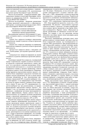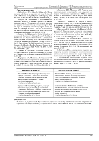 9. Маляшова А.Ю., Зиятдинова Ю.Н. Готовность студентов технологического вуза к проектной деятельности // Ученые записки Крымского федерального университета имени В.И. Вернадского. Социология. Педагогика. Психология. 2022. Т. 8 (74), специальный выпуск. С. 47-55. EDN: OKDOYX