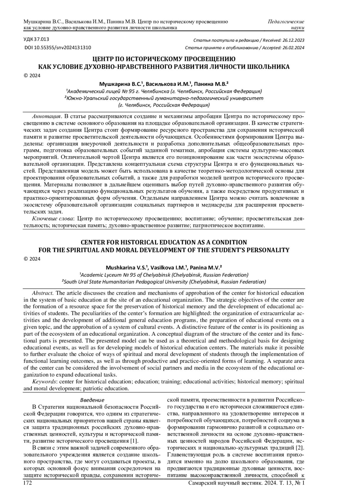 В статье рассматриваются создание и механизмы апробации Центра по историческому просвещению в системе основного образования на площадке образовательной организации. В качестве стратегических задач создания Центра стоит формирование ресурсного пространства для сохранения исторической памяти и развитие просветительской деятельности обучающихся. Особенностями формирования Центра выделены: организация внеурочной деятельности и разработка дополнительных общеобразовательных программ, подготовка образовательных событий заданной тематики, апробация системы культурно-массовых мероприятий. Отличительной чертой Центра является его позиционирование как части экосистемы образовательной организации. Представлена концептуальная схема структуры Центра и его функциональных частей. Представленная модель может быть использована в качестве теоретико-методологической основы для проектирования образовательных событий, а также для разработки моделей центров исторического просвещения. Материалы позволяют в дальнейшем оценивать выбор путей духовно-нравственного развития обучающихся через реализацию функциональных результатов обучения, а также посредством продуктивных и практико-ориентированных форм обучения. Отдельным направлением Центра можно считать вовлечение в экосистему образовательной организации социальных партнеров и медиасреды для расширения просветительских задач.