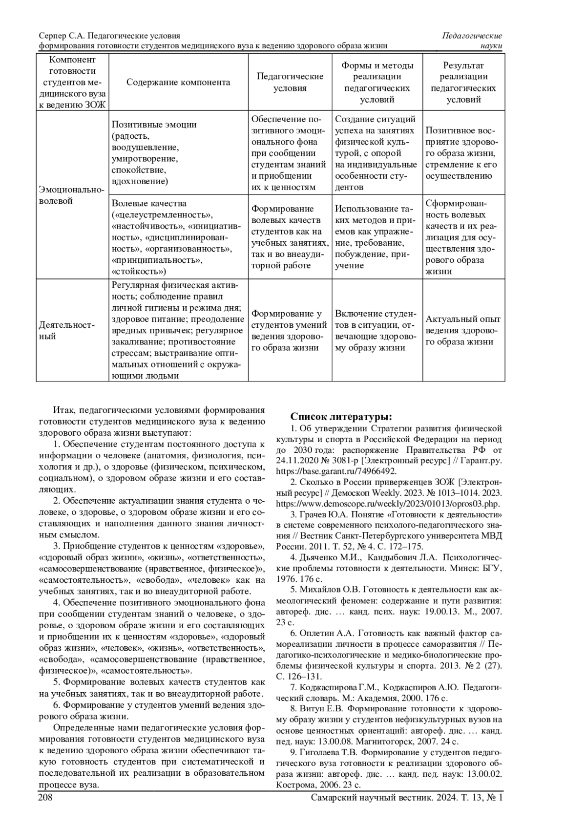 СЕРПЕР С. А. ПЕДАГОГИЧЕСКИЕ УСЛОВИЯ ФОРМИРОВАНИЯ ГОТОВНОСТИ СТУДЕНТОВ МЕДИЦИНСКОГО ВУЗА К ВЕДЕНИЮ ЗДОРОВОГО ОБРАЗА ЖИЗНИ // САМАРСКИЙ НАУЧНЫЙ ВЕСТНИК. 2024. ТОМ 13, № 1