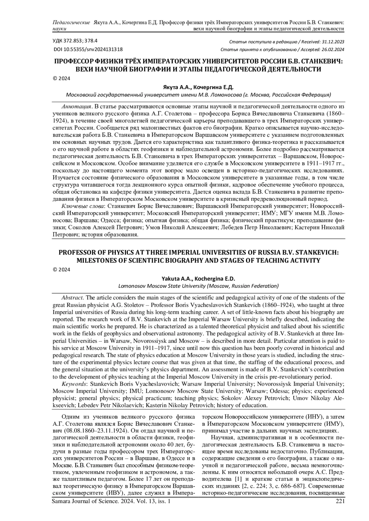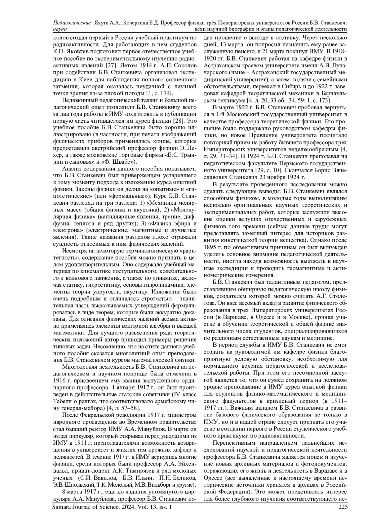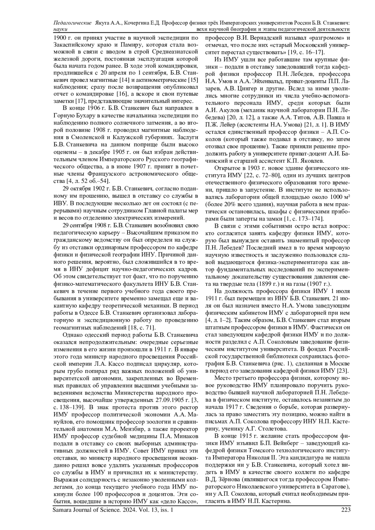 ЯКУТА А. А., КОЧЕРГИНА Е. Д. ПРОФЕССОР ФИЗИКИ ТРЁХ ИМПЕРАТОРСКИХ УНИВЕРСИТЕТОВ РОССИИ Б. В. СТАНКЕВИЧ: ВЕХИ НАУЧНОЙ БИОГРАФИИ И ЭТАПЫ ПЕДАГОГИЧЕСКОЙ ДЕЯТЕЛЬНОСТИ // САМАРСКИЙ НАУЧНЫЙ ВЕСТНИК. 2024. ТОМ 13, № 1