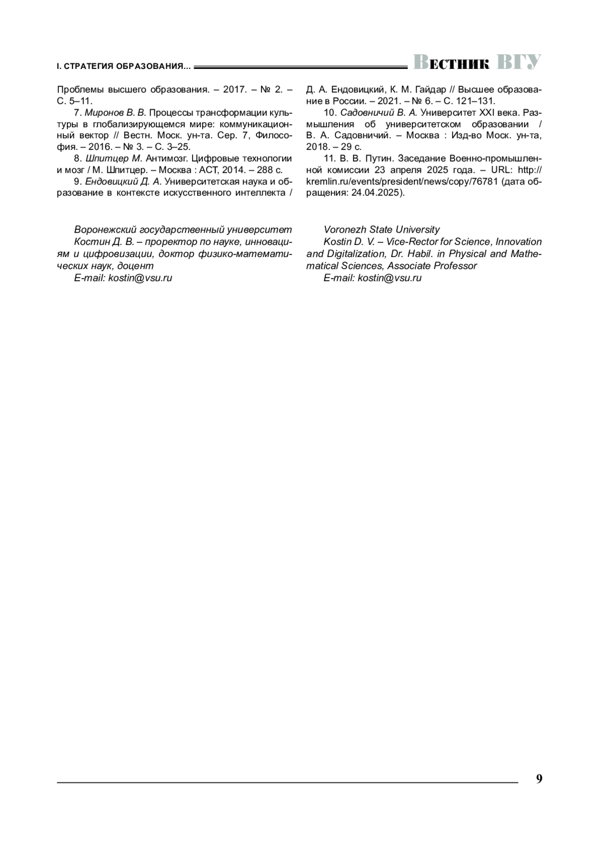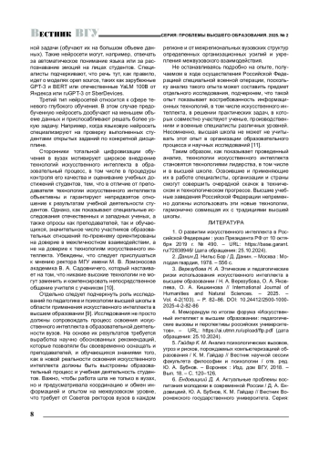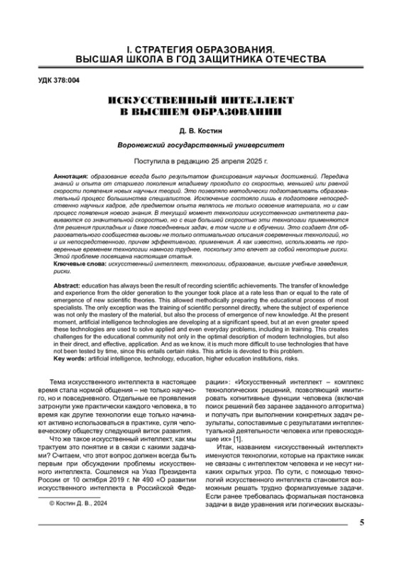 КОСТИН В. А. ИСКУССТВЕННЫЙ ИНТЕЛЛЕКТ В ВЫСШЕМ ОБРАЗОВАНИИ // ВЕСТНИК ВОРОНЕЖСКОГО ГОСУДАРСТВЕННОГО УНИВЕРСИТЕТА. СЕРИЯ: ПРОБЛЕМЫ ВЫСШЕГО ОБРАЗОВАНИЯ. 2025. № 2