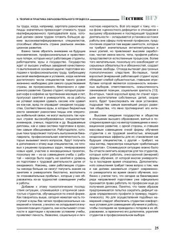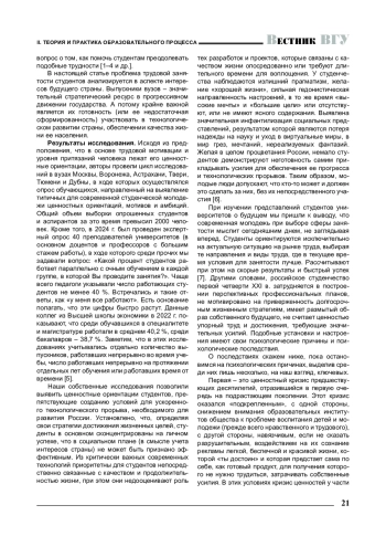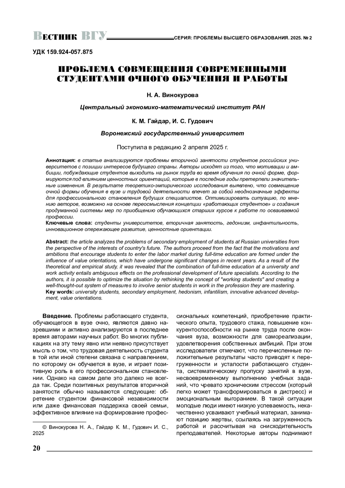В статье анализируются проблемы вторичной занятости студентов российских университетов с позиции интересов будущего страны. Авторы исходят из того, что мотивации и амбиции, побуждающие студентов выходить на рынок труда во время обучения по очной форме, формируются под влиянием ценностных ориентаций, которые в последние годы претерпели значительные изменения. В результате теоретико-эмпирического исследования выявлено, что совмещение очной формы обучения в вузе и трудовой деятельности влечет за собой неоднозначные эффекты для профессионального становления будущих специалистов. Оптимизировать ситуацию, по мнению авторов, возможно на основе переосмысления концепции «работающих студентов» и создания продуманной системы мер по приобщению обучающихся старших курсов к работе по осваиваемой профессии.