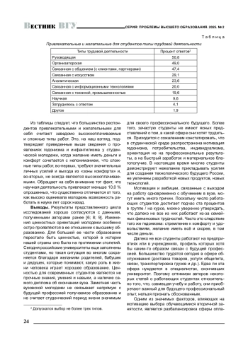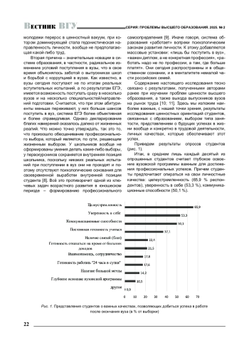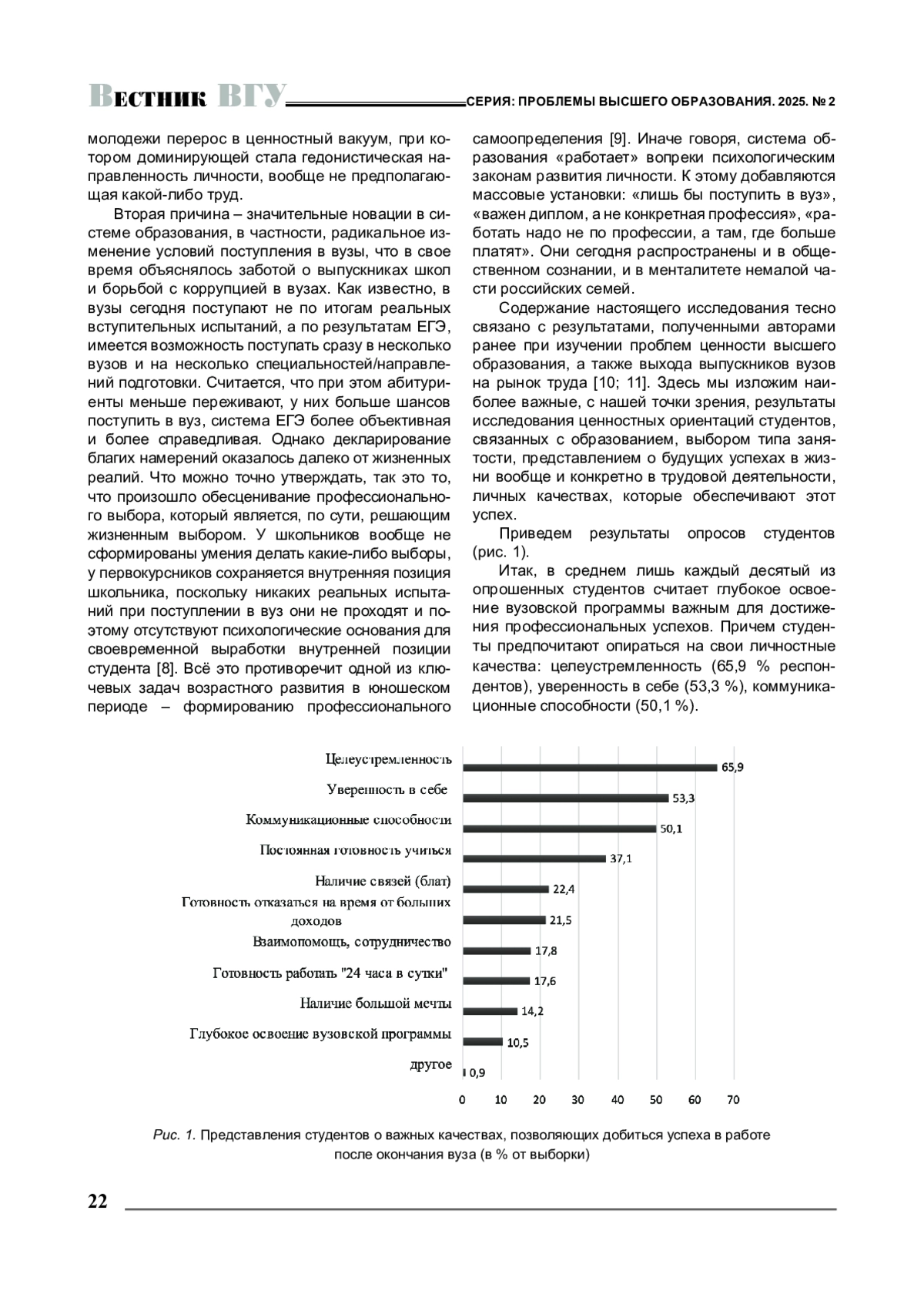 При изучении представлений студентов университетов о будущем мы пришли к выводу, что современная молодежь при выборе сферы занятости мыслит сегодняшним днем, не заглядывая вперед. Студенты ориентируются исключительно на актуальную ситуацию на рынке труда, выбирая те направления и виды труда, где в текущее время условия для занятости лучше. Рассчитывают при этом на скорые результаты и быстрый успех [7]. Другими словами, российское студенчество первой четверти XXI в. затрудняется в построении перспективных профессиональных планов, не мотивировано на приверженность долгосрочным жизненным стратегиям, имеет размытый образ собственного будущего, не считает ценностью упорный труд и достижения, требующие значительных усилий. Подобные установки и настроения имеют свои психологические причины и психологические последствия.
