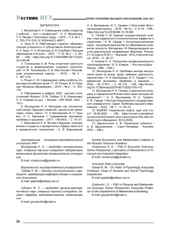 11. Винокурова Н. А. Почему студенческая молодежь в современной России низко ценит высшее образование? / Н. А. Винокурова, И. С. Гудович, К. М. Гайдар // Вестник Воронежского государственного университета. Серия: Проблемы высшего образования. - 2022. - № 1. - С. 28-33. EDN: MJCJBX