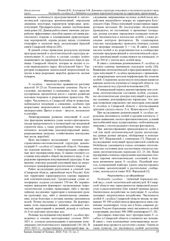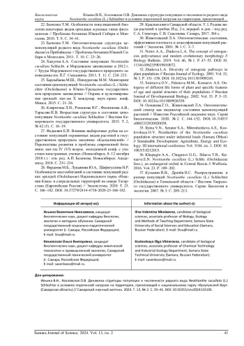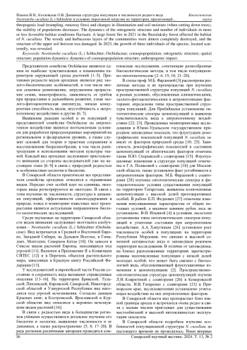 35. Ilyina V.N., Senator S.A., Mitroshenkova A.E., Kozlovskaya O.V. Peculiarities of the Neottianthe cucullata population structure under industrial loads (Samara Oblast) // Sustainable Development: Agriculture, Energy and Ecology: III international conference Vol. 3184, iss. 1. DOI: 10.1063/5.0212015