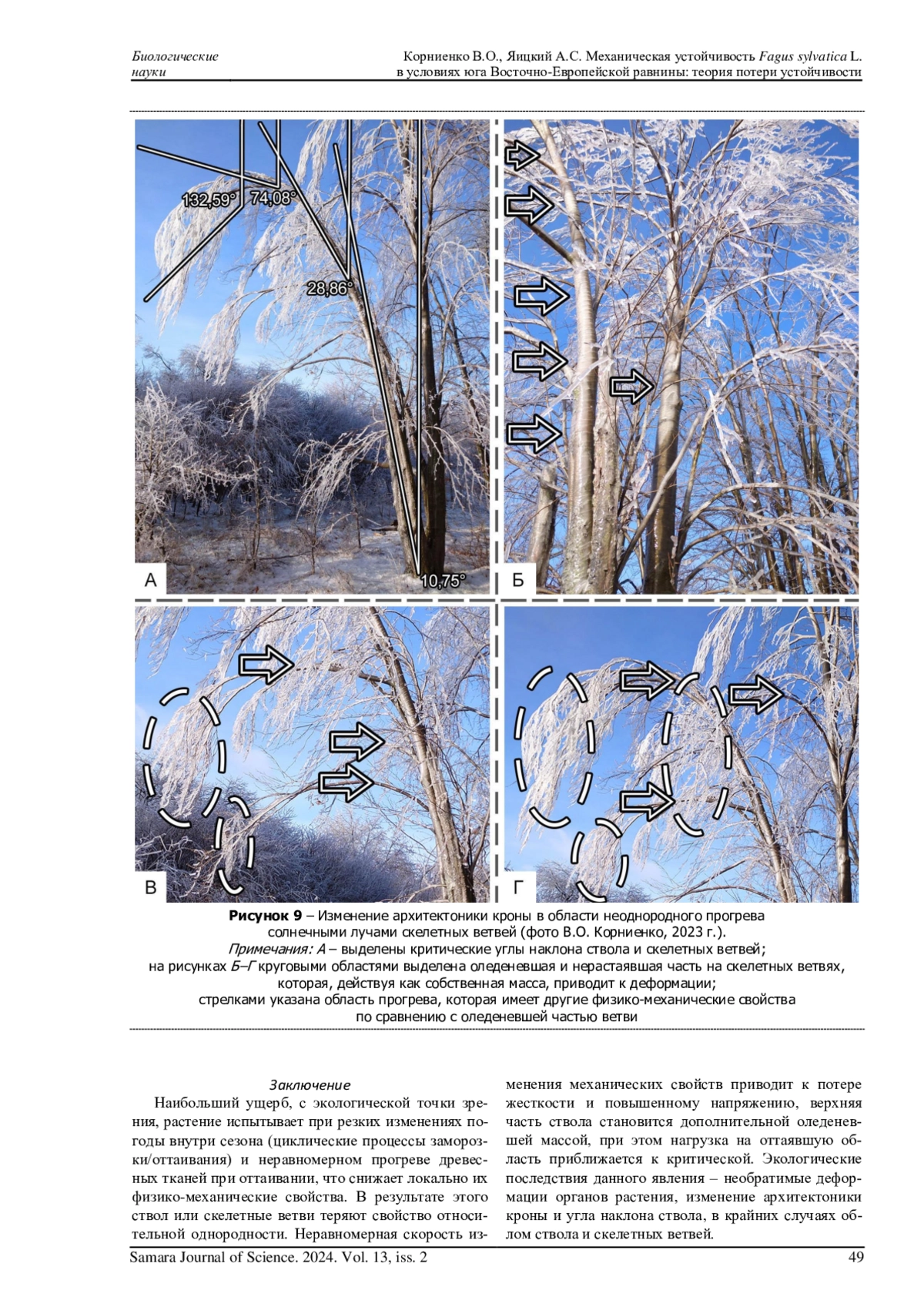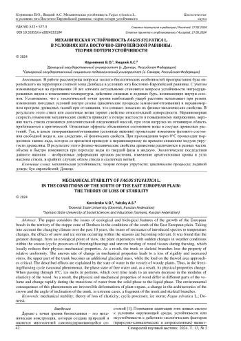 В работе рассмотрены вопросы эколого-биологических особенностей произрастания бука европейского на территории степной зоны Донбасса в условиях юга Восточно-Европейской равнины. С учетом изменяющегося на протяжении 10 лет климата актуальными становятся вопросы устойчивости интродуцированных видов к изменениям температуры, действию снежных и ледяных бурь, возникающих внутри сезонов. Установлено, что с экологической точки зрения наибольший ущерб растение испытывает при резких изменениях погодных условий внутри сезона (циклические процессы заморозки/оттаивания) и неравномерном прогреве древесных тканей при оттаивании, что снижает локально их физико-механические свойства. В результате этого ствол или скелетные ветви теряют свойство относительной однородности. Неравномерная скорость изменения механических свойств приводит к потере жесткости и повышенному напряжению, верхняя часть ствола становится дополнительной оледеневшей массой, при этом нагрузка на оттаявшую область приближается к критической. Описанные эффекты объясняются состоянием воды в сосудах древесных растений. Так, в цикле замораживания/оттаивания (сезонные явления) происходит изменение фазового состояния свободной воды и, как следствие, её физических свойств. При прохождении через 0°C происходит порционное таяние льда, которое со временем приводит к неравномерному во времени снижению модуля упругости древесины. В результате этого физико-механические свойства древесины различаются в разных частях объема и быстро изменяются при переходе воды из твердой фазы в жидкую. Экологические последствия данного явления - необратимые деформации органов растения, изменение архитектоники кроны и угла наклона ствола, в крайних случаях облом ствола и скелетных ветвей.