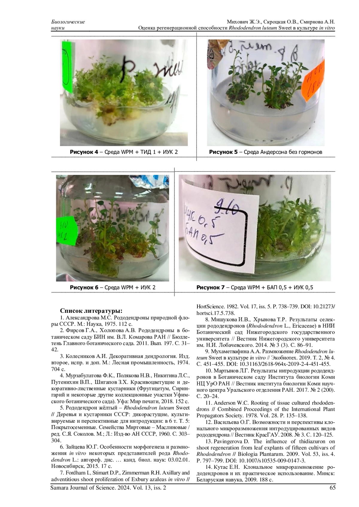31. Zaytseva Y.G., Poluboyarova T.V., Novikova T.I. Effects of thidiazuron on in vitro morphogenic response of Rhododendron sichotense Pojark. and Rhododendron catawbiense cv. Grandiflorum leaf explants // In vitro Cellular & Developmental Biology - Plant. 2016. Vol. 52, iss. 1. P. 56-63. DOI: 10.1007/s11627-015-9737-2 EDN: WQDCZB