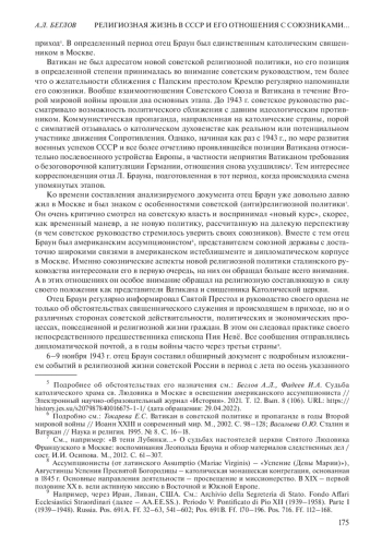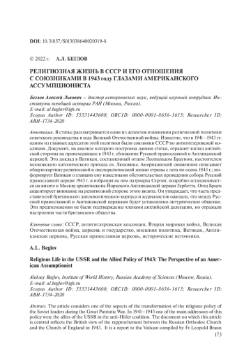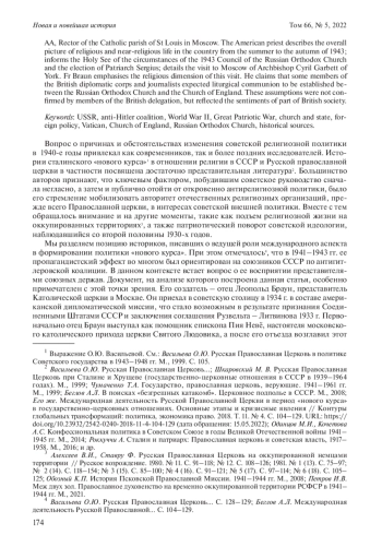 В статье рассматривается один из аспектов изменения религиозной политики советского руководства в ходе Великой Отечественной войны. Известно, что в 1941–1943 гг. одним из главных адресатов этой политики были союзники СССР по антигитлеровской коалиции. Документ, на анализе которого построена данная статья, отражает взгляд английской стороны на происходившее в 1943 г. сближение Русской православной и Англиканской церквей. Это доклад в Ватикан, составленный отцом Леопольдом Брауном, настоятелем московского католического прихода св. Людовика. Американский священник описывает общую картину религиозной и околорелигиозной жизни страны с лета по осень 1943 г.; информирует Ватикан о ставших ему известными обстоятельствах проведения собора Русской православной церкви 1943 г. и избрания на нем патриарха Сергия; подробно останавливается на визите в Москву архиепископа Йоркского Англиканской церкви Гарбетта. Отец Браун акцентирует внимание на религиозной стороне этого визита. Он утверждает, что часть представителей британского дипломатического корпуса и журналистов ожидала, что между Русской православной и Англиканской церквами будет установлено литургическое общение. Эти предположения не были подтверждены членами английской делегации, но отражали настроения части британского общества.