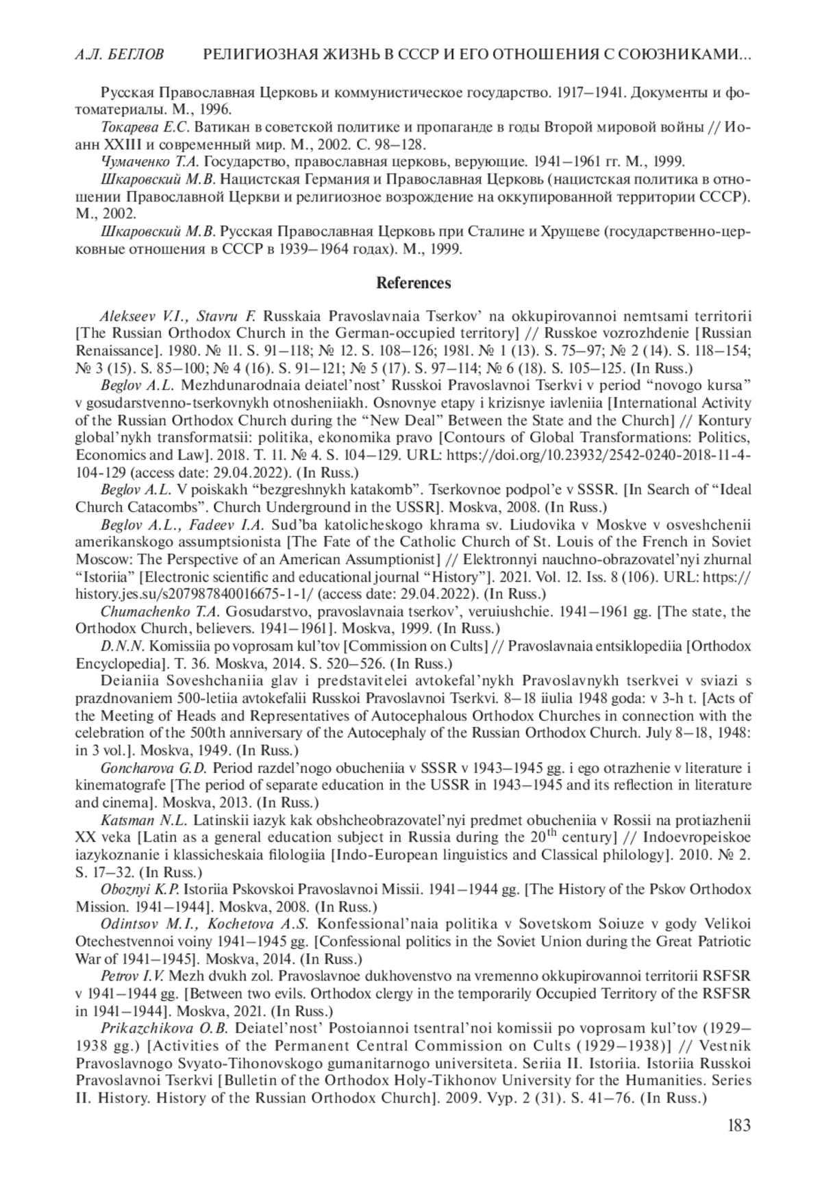 3. Беглов А.Л. Международная деятельность Русской Православной Церкви в период “нового курса” в государственно-церковных отношениях. Основные этапы и кризисные явления // Контуры глобальных трансформаций: политика, экономика право. 2018. Т. 11. № 4. С. 104-129. URL: 10.23932/2542-0240-2018-11-4-104-129 (дата обращения: 15.05.2022). DOI: 10.23932/2542-0240-2018-11-4-104-129( EDN: VLBORM