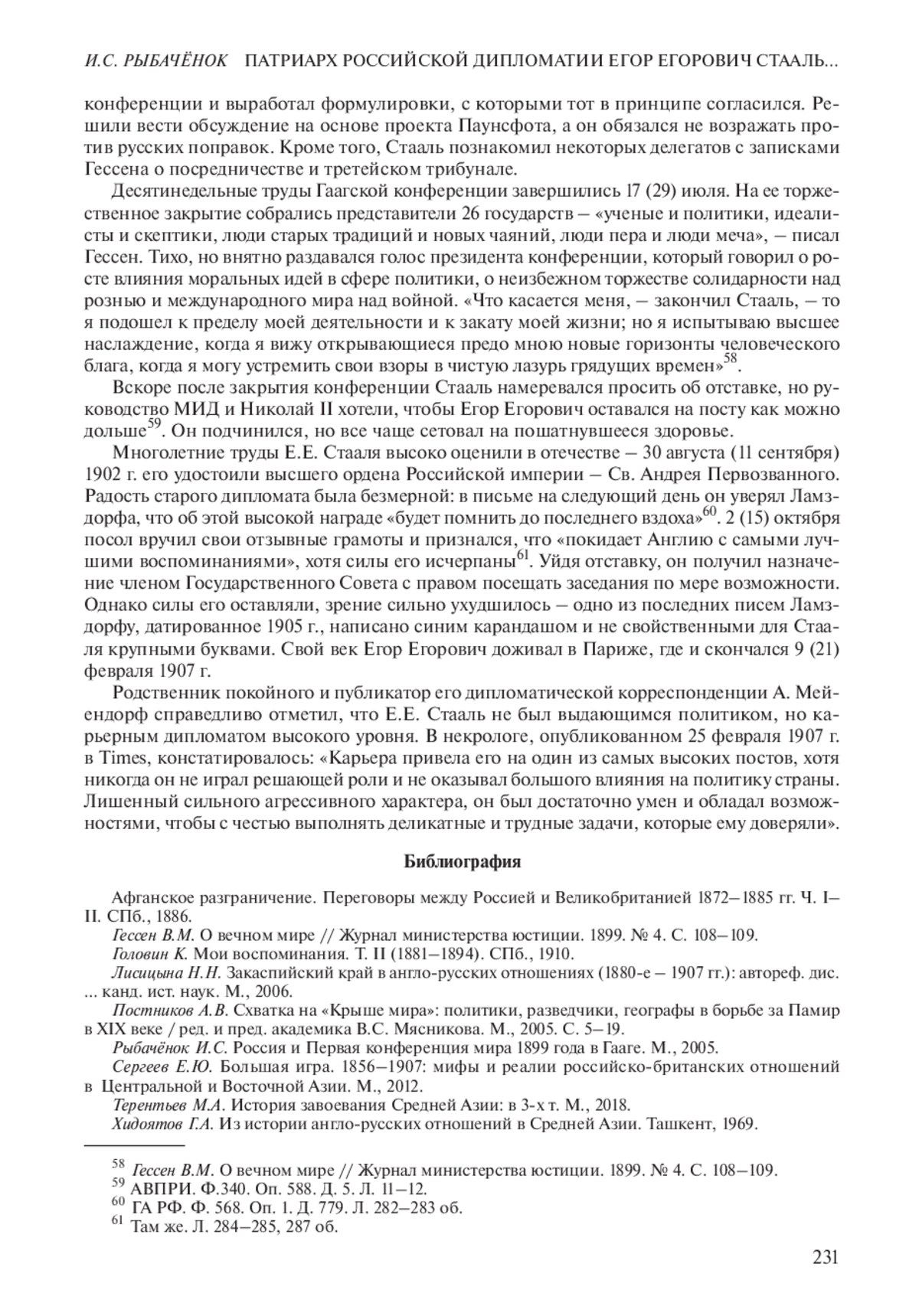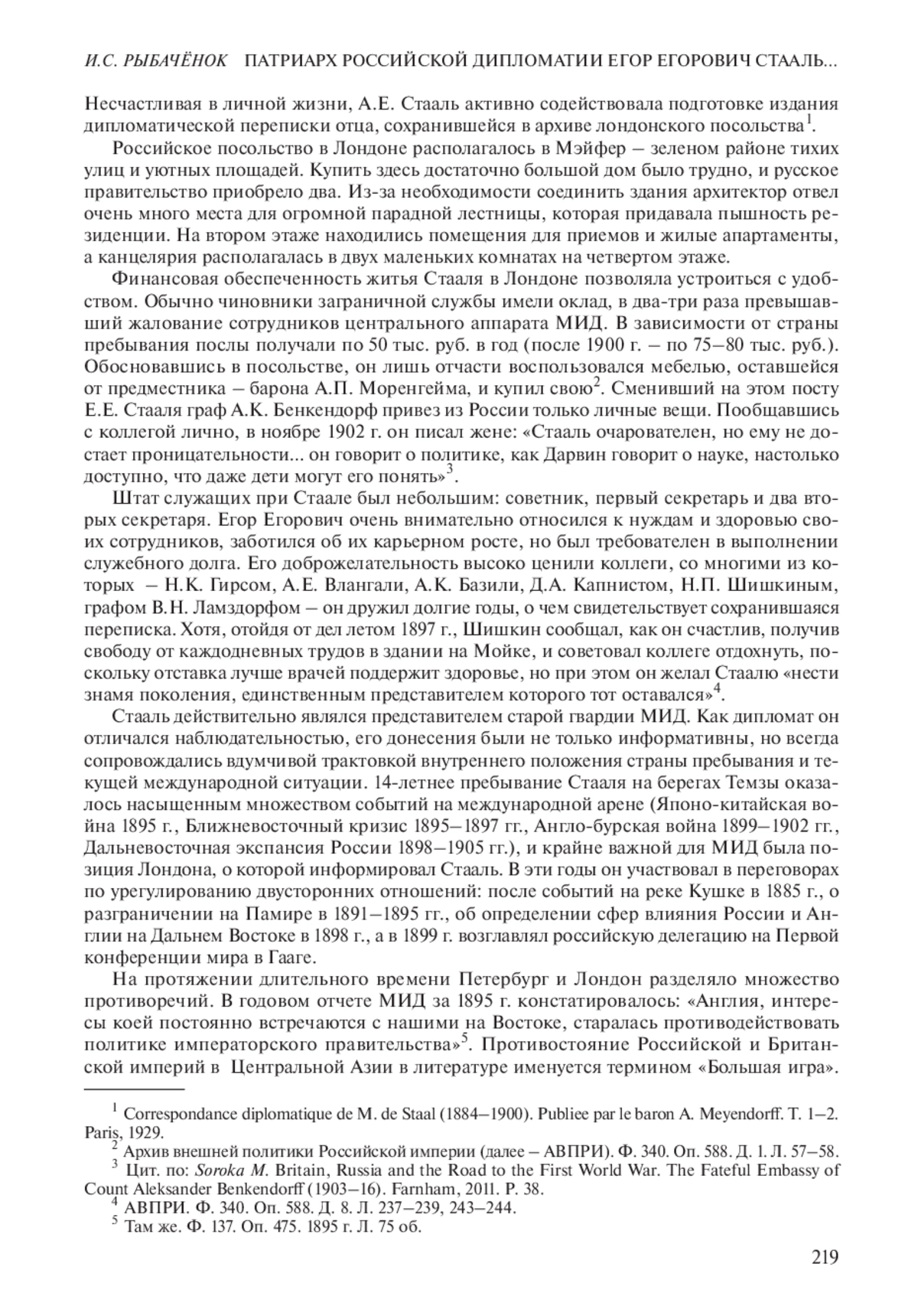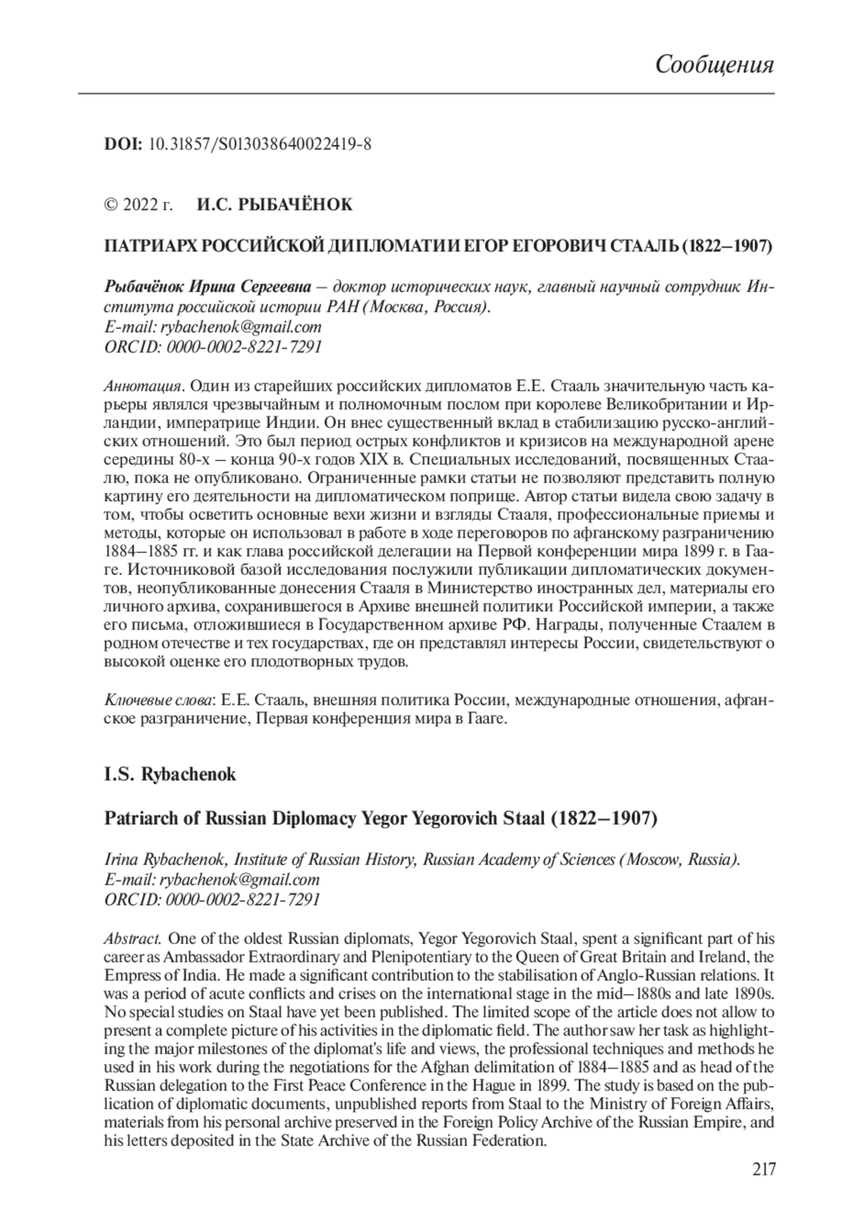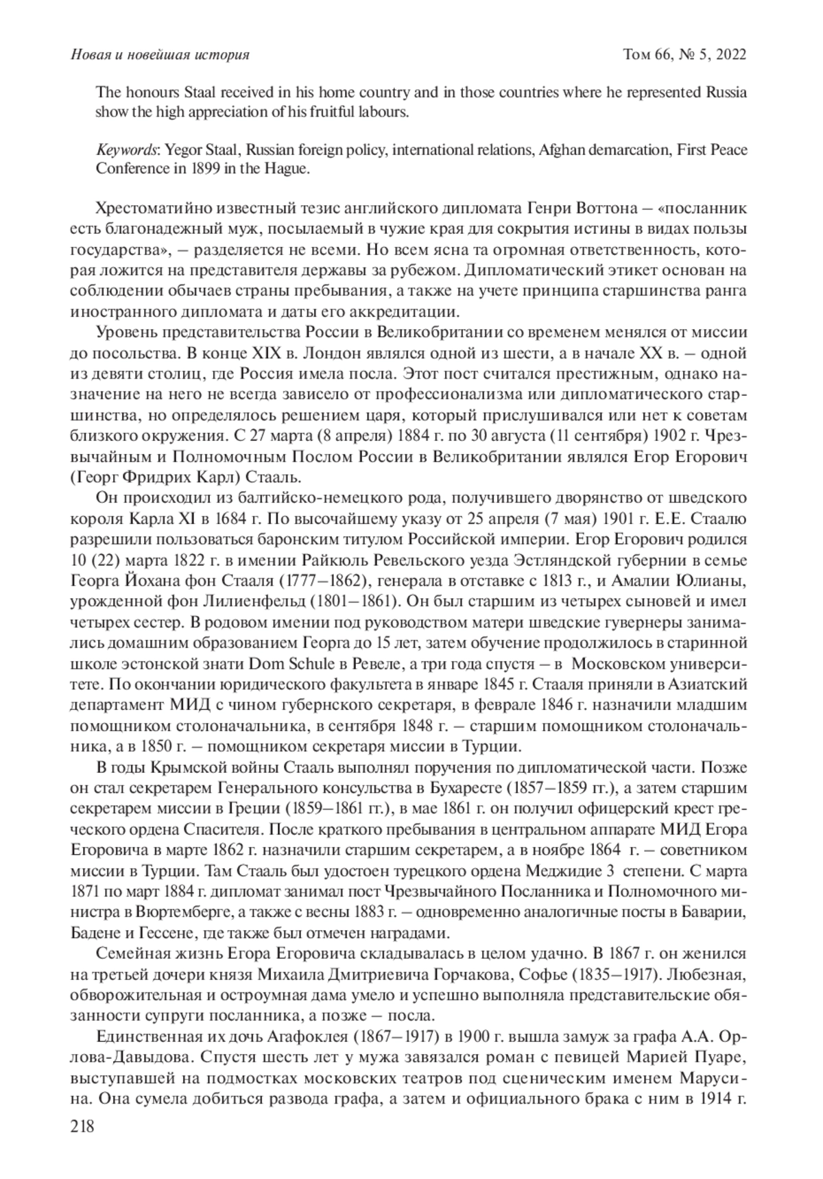 Один из старейших российских дипломатов Е. Е. Стааль значительную часть карьеры являлся чрезвычайным и полномочным послом при королеве Великобритании и Ирландии, императрице Индии. Он внес существенный вклад в стабилизацию русско-английских отношений. Это был период острых конфликтов и кризисов на международной арене середины 80-х – конца 90-х годов XIX в. Специальных исследований, посвященных Стаалю, пока не опубликовано. Ограниченные рамки статьи не позволяют представить полную картину его деятельности на дипломатическом поприще. Автор статьи видела свою задачу в том, чтобы осветить основные вехи жизни и взгляды Стааля, профессиональные приемы и методы, которые он использовал в работе в ходе переговоров по афганскому разграничению 1884–1885 гг. и как глава российской делегации на Первой конференции мира 1899 г. в Гааге. Источниковой базой исследования послужили публикации дипломатических документов, неопубликованные донесения Стааля в Министерство иностранных дел, материалы его личного архива, сохранившегося в Архиве внешней политики Российской империи, а также его письма, отложившиеся в Государственном архиве РФ. Награды, полученные Стаалем в родном отечестве и тех государствах, где он представлял интересы России, свидетельствуют о высокой оценке его плодотворных трудов