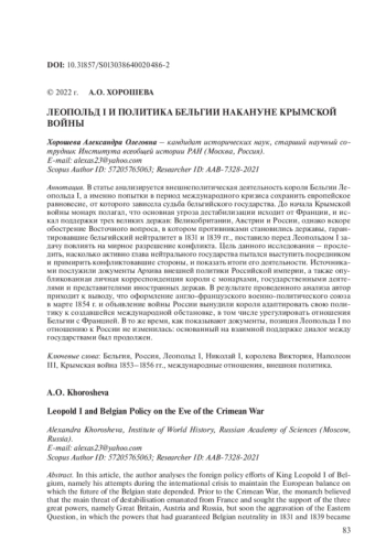 В статье анализируется внешнеполитическая деятельность короля Бельгии Леопольда I, а именно попытки в период международного кризиса сохранить европейское равновесие, от которого зависела судьба бельгийского государства. До начала Крымской войны монарх полагал, что основная угроза дестабилизации исходит от Франции, и искал поддержки трех великих держав: Великобритании, Австрии и России, однако вскоре обострение Восточного вопроса, в котором противниками становились державы, гарантировавшие бельгийский нейтралитет в 1831 и 1839 гг., поставило перед Леопольдом I задачу повлиять на мирное разрешение конфликта. Цель данного исследования – проследить, насколько активно глава нейтрального государства пытался выступить посредником и примирить конфликтовавшие стороны, и показать итоги его деятельности. Источниками послужили документы Архива внешней политики Российской империи, а также опубликованная личная корреспонденция короля с монархами, государственными деятелями и представителями иностранных держав. В результате проведенного анализа автор приходит к выводу, что оформление англо-французского военно-политического союза в марте 1854 г. и объявление войны России вынудили короля адаптировать свою политику к создавшейся международной обстановке, в том числе урегулировать отношения Бельгии с Францией. В то же время, как показывают документы, позиция Леопольда I по отношению к России не изменилась: основанный на взаимной поддержке диалог между государствами был продолжен
