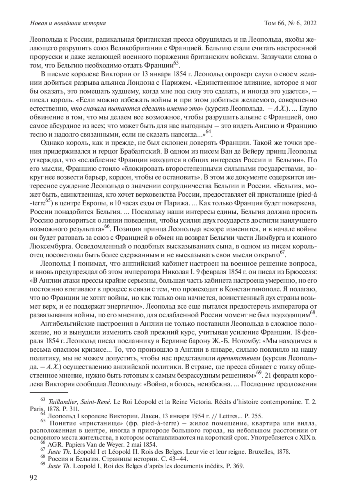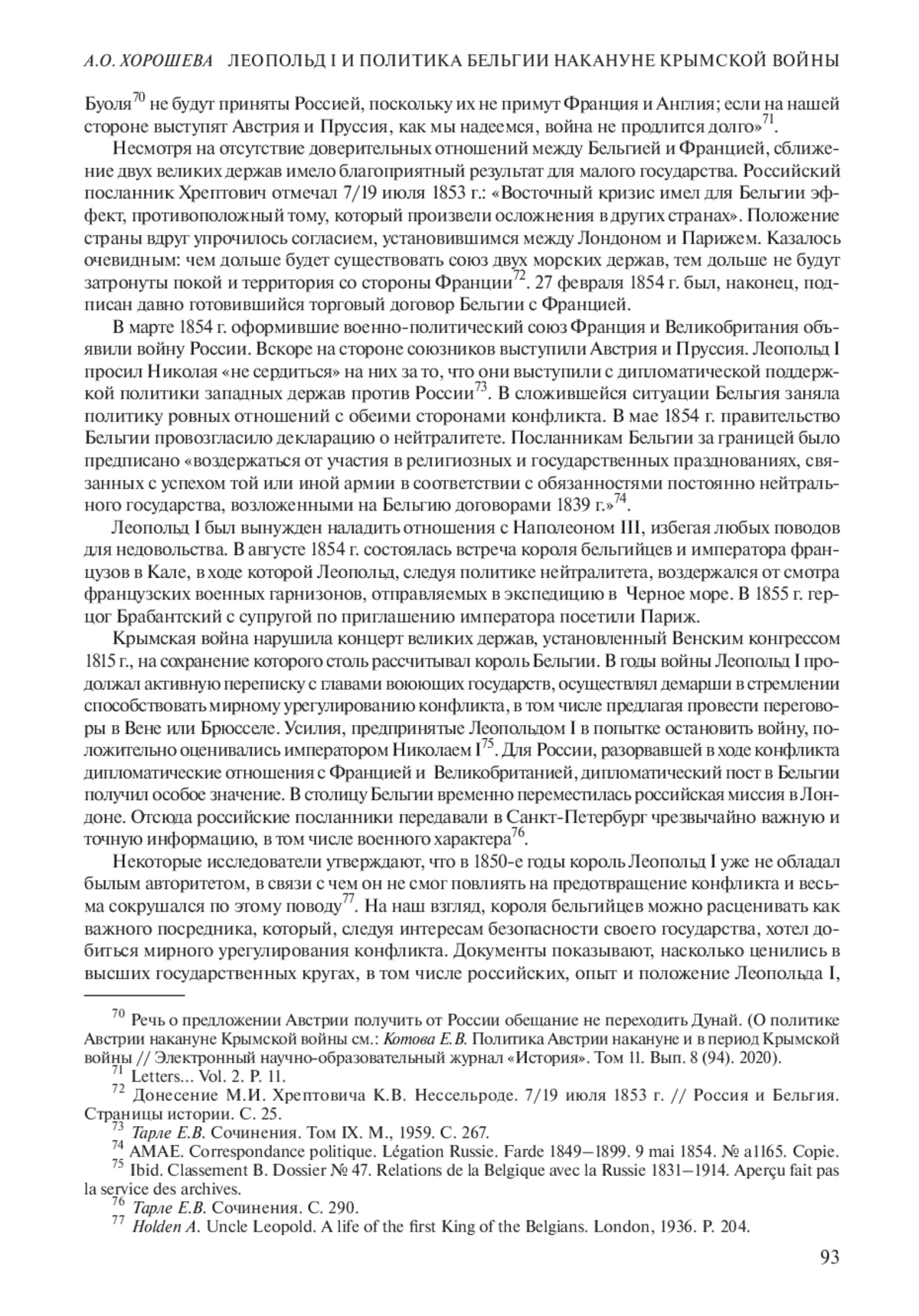 Внешняя политика Бельгии в период царствования короля Леопольда I (1790–1865), правившего с 1831 г., отличалась тем, что безраздельно находилась в руках монарха. Для осуществления своих целей Леопольд I использовал династические связи и личные каналы. Зачастую он не ставил в известность министерство иностранных дел о своих действиях, отделяя собственную позицию от политики правительства1. «Моя роль с 1831 г. очень проста: управляя кораблем, я совершаю маневры, которые необходимы для того, чтобы сохранить его на плаву…» – писал король в канун начала Крымской войны2. Обширная переписка короля с главами государств, иностранными политическими деятелями, личные визиты монарха в другие государства, его общение с представителями иностранных государств, аккредитованными при бельгийском дворе, наглядно подтверждают это. Особый интерес в этом контексте представляют донесения российского посланника в Брюсселе М. И. Хрептовича и письма Леопольда I Николаю I за период 1853–1854 гг., хранящиеся в Архиве внешней политики Российской империи. Эти документы ранее не рассматривались исследователями при изучении внешней политики Бельгии данного периода и при освещении дипломатических переговоров довоенного периода. Однако они позволяют дополнить анализ политической деятельности Леопольда I, показать его заинтересованность в поисках мирных решений и желание поддерживать взаимовыгодные отношения с Россией