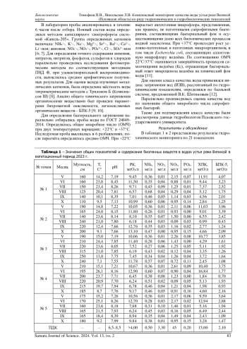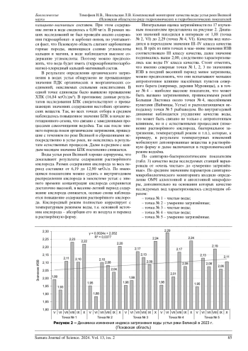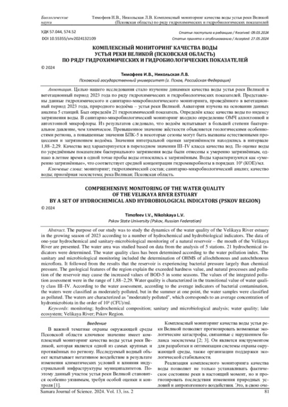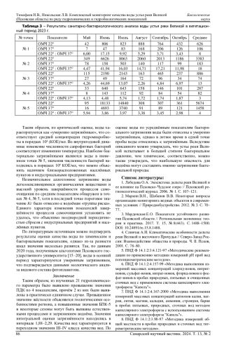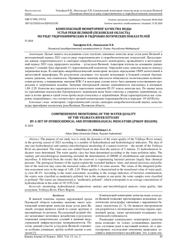 Целью нашего исследования стало изучение динамики качества воды устья реки Великой в вегетационный период 2023 года по ряду гидрохимических и гидробиологических показателей. Представлены данные гидрохимического и санитарно-микробиологического мониторинга, проведённого в вегетационный период 2023 года, природного водоёма - устья реки Великой. Акватория изучена на основании данных анализа 5 станций. Был определён 21 гидрохимический показатель. Определён класс качества воды по индексу загрязнения воды. В санитарно-микробиологический мониторинг входило определение ОМЧ аллохтонной и автохтонной микрофлоры. Из результатов следовало, что водоём испытывает в большей степени бактериальное давление, чем химическое. Превышенное значение жёсткости объясняется геологическими особенностями региона, а повышенные значения БПК-5 в некоторые сезоны могут быть вызваны естественными процессами и загрязнением водоёма. Значения интегральной оценки загрязнённости находились в интервале 1,88-2,29. Качества вод характеризуется в переходном значении III-IV класса качества вод. По оценке воды по усреднённым показателям бактериального загрязнения воды были отнесены к умеренно загрязнённым, однако в летнее время в одной точке пробы воды относились к загрязнённым. Воды характеризуются как «умеренно загрязнённые», что соответствует средней концентрации гидромикробиоты в порядках 10³ (КОЕ)/мл.