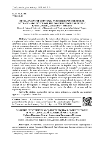 Статья: РАЗВИТИЕ СТРАТЕГИЧЕСКОГО ПАРТНЕРСТВА В СФЕРЕ ТОРГОВЛИ И УСЛУГ ДОНЕЦКОЙ НАРОДНОЙ РЕСПУБЛИКИ (2025)