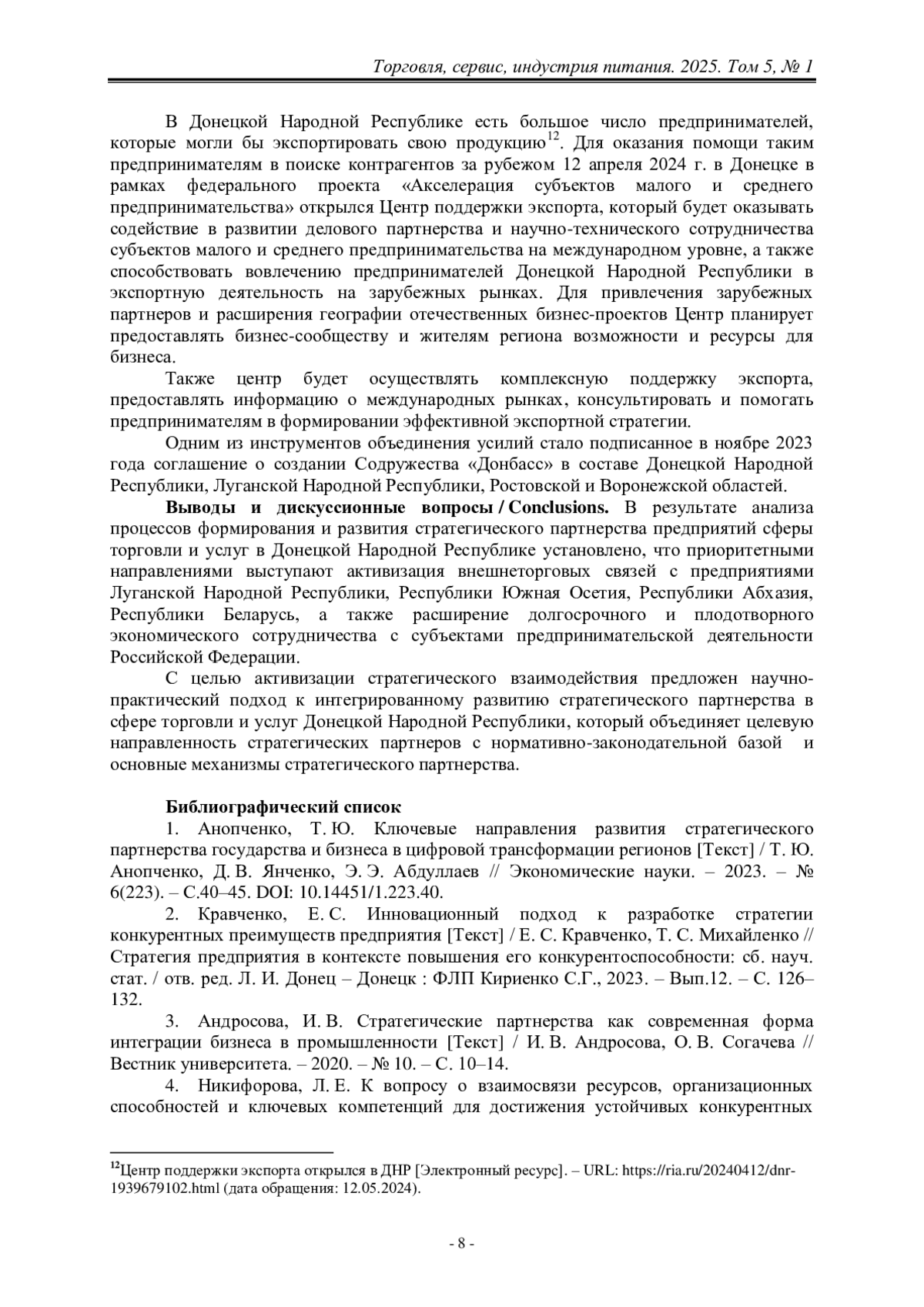 8. Сергеева, А. В. Синергетические мейнстримы развития стратегического партнерства предпринимательских структур Донецкой Народной Республики [Текст] / А. В. Сергеева // Проблемы современной экономики. – Сакт-Петербург : ООО НПК «РОСТ», 2022. – № 3(83). – С. 170–176.