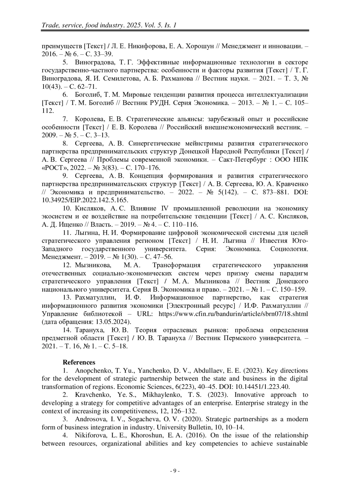 ДОНЕЦ Л. И., ШТИХОВА А. В. РАЗВИТИЕ СТРАТЕГИЧЕСКОГО ПАРТНЕРСТВА В СФЕРЕ ТОРГОВЛИ И УСЛУГ ДОНЕЦКОЙ НАРОДНОЙ РЕСПУБЛИКИ // ТОРГОВЛЯ, СЕРВИС, ИНДУСТРИЯ ПИТАНИЯ. 2025. № 1, ТОМ 5