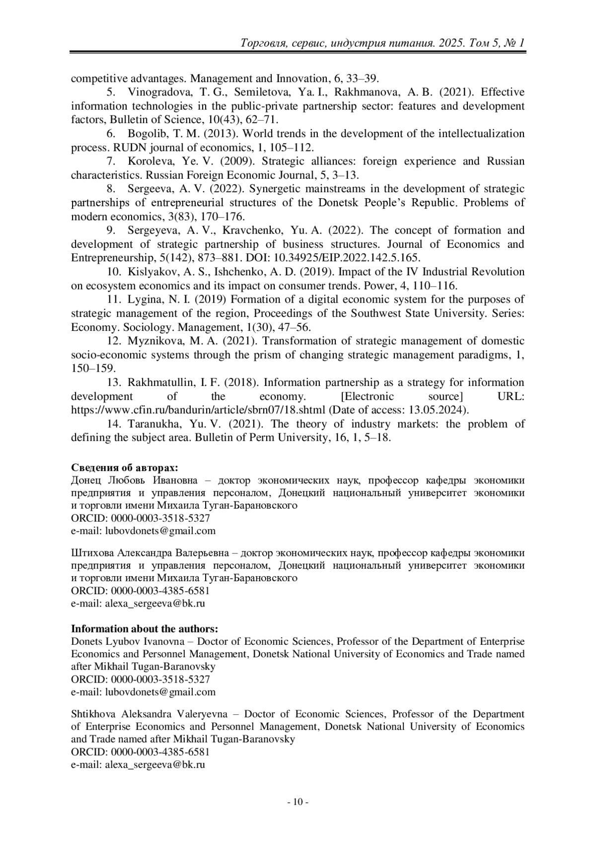 9. Сергеева, А. В. Концепция формирования и развития стратегического партнерства предпринимательских структур [Текст] / А. В. Сергеева, Ю. А. Кравченко // Экономика и предпринимательство. – 2022. – № 5(142). – С. 873–881. DOI: 10.34925/EIP.2022.142.5.165.