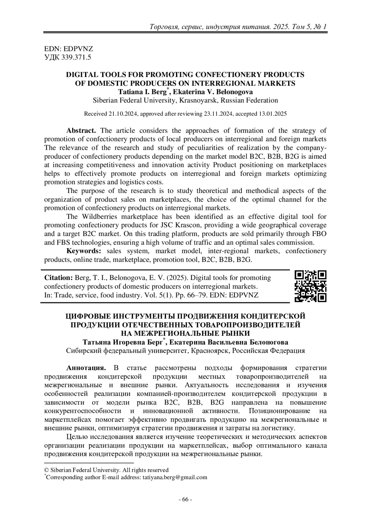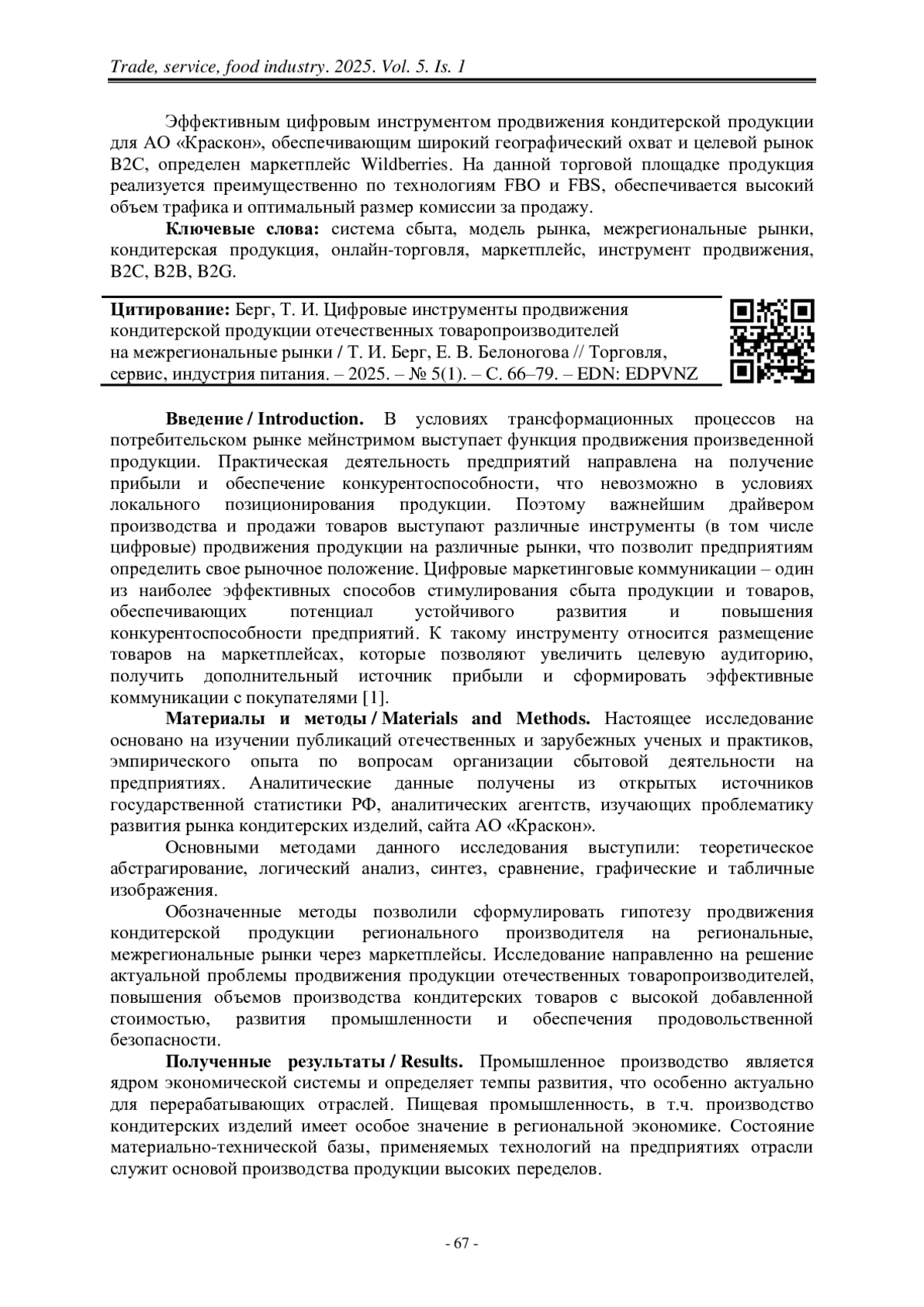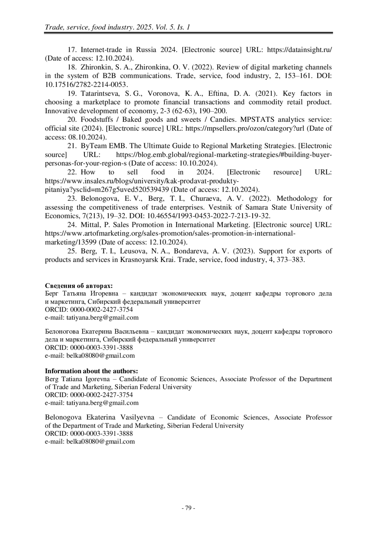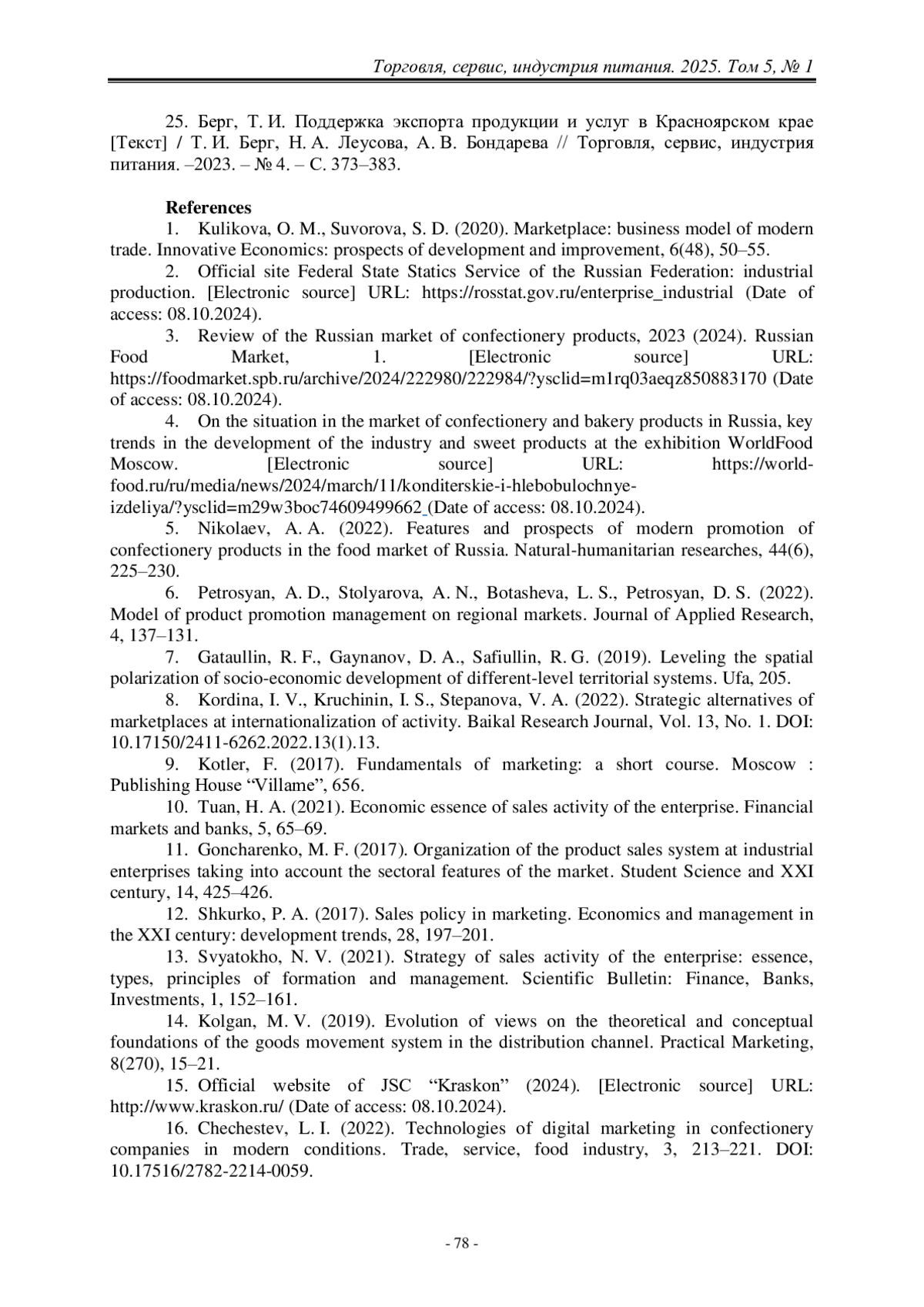 25. Берг, Т. И. Поддержка экспорта продукции и услуг в Красноярском крае [Текст] / Т. И. Берг, Н. А. Леусова, А. В. Бондарева // Торговля, сервис, индустрия питания. –2023. – № 4. – С. 373–383.