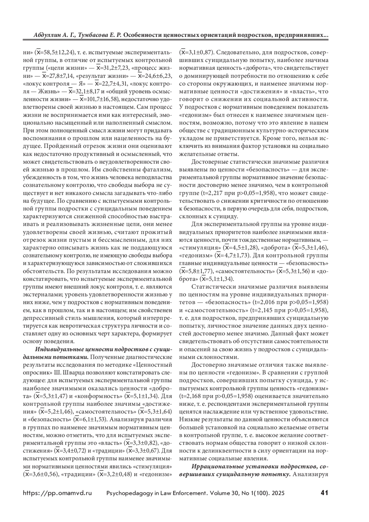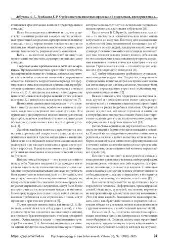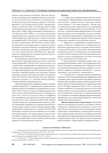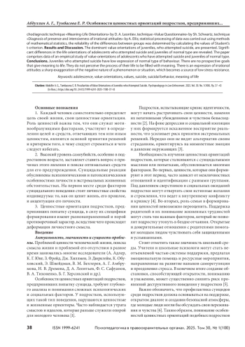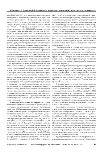 Рассматривается проблема изучения особенностей ценностных ориентаций подростков, предпринявших попытку суицида. Сложный возрастной период, переживание кризиса идентичности, межличностные и внутрисемейные конфликты и другие факторы выступают благоприятной почвой для развития потенциально опасных тенденций подростка к суициду. В подростковый период активно закрепляются ценностные ориентации, формируется направленность личности подростка. Отсюда возникает интерес к данной возрастной группе как наиболее непредсказуемой, способной руководствоваться эмоциями и тем самым отрываться от реалий жизни. Чаще всего такая форма поведения свойственна подросткам с суицидальными наклонностями, чьи жизненные ценности в значительной степени отличаются от нормотипичных сверстников. Цель — выявление особенностей ценностных ориентаций подростков, предпринявших попытку суицида. Материалы и методы. Использовались метод теоретического анализа научных источников по проблеме исследования; эмпирический метод, включающий применение психодиагностической методики «Смысложизненные ориентации» Д. А. Леонтьева, методики «Ценностный опросник» Ш. Шварца, методики «Диагностика наличия и выраженности иррациональных установок» А. Эллиса; статистическая обработка данных проводилась с помощью методов математической статистики, достоверность различий полученных данных между группами определялась путем расчета значений t-критерия Стьюдента. Результаты и обсуждение. Представлены доминирующие ценностные ориентации подростков, предпринявших попытку суицида. Выявлены значимые различия в жизненных ориентациях подростков, совершивших попытку суицида, и нормотипичных подростков. Приводятся данные эмпирического исследования ценностных ориентаций подростков, предпринявших попытку суицида, и нормотипичных подростков. Выводы. Подростки, предпринявшие попытку суицида, имеют низкую выраженность нормативного типа поведения. У них отсутствуют перспективные цели, придающие жизни осмысленность, они не воспринимают процесс своей жизни наполненным смыслом. Наблюдается выраженность иррациональных установок: резкое преувеличение негативного характера явления или ситуации, что становится источником низкой стрессоустойчивости.