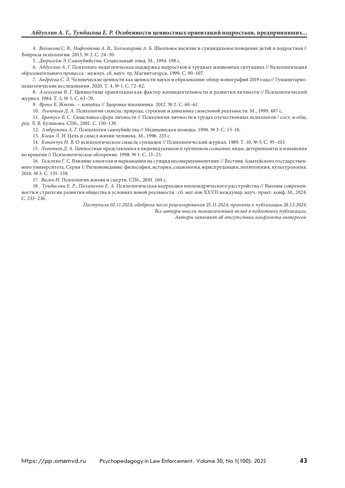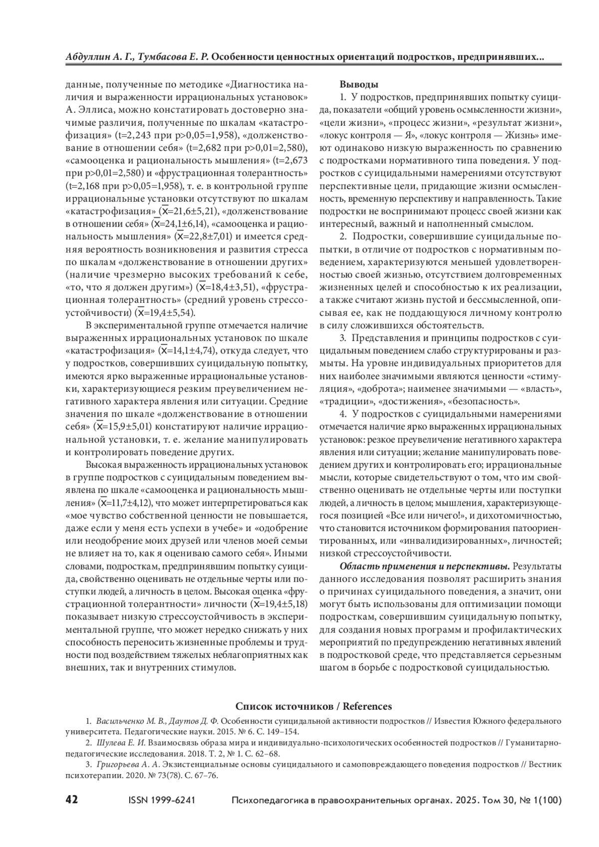 1. Васильченко М. В., Даутов Д. Ф. Особенности суицидальной активности подростков // Известия Южного федерального университета. Педагогические науки. 2015. № 6. С. 149–154.
