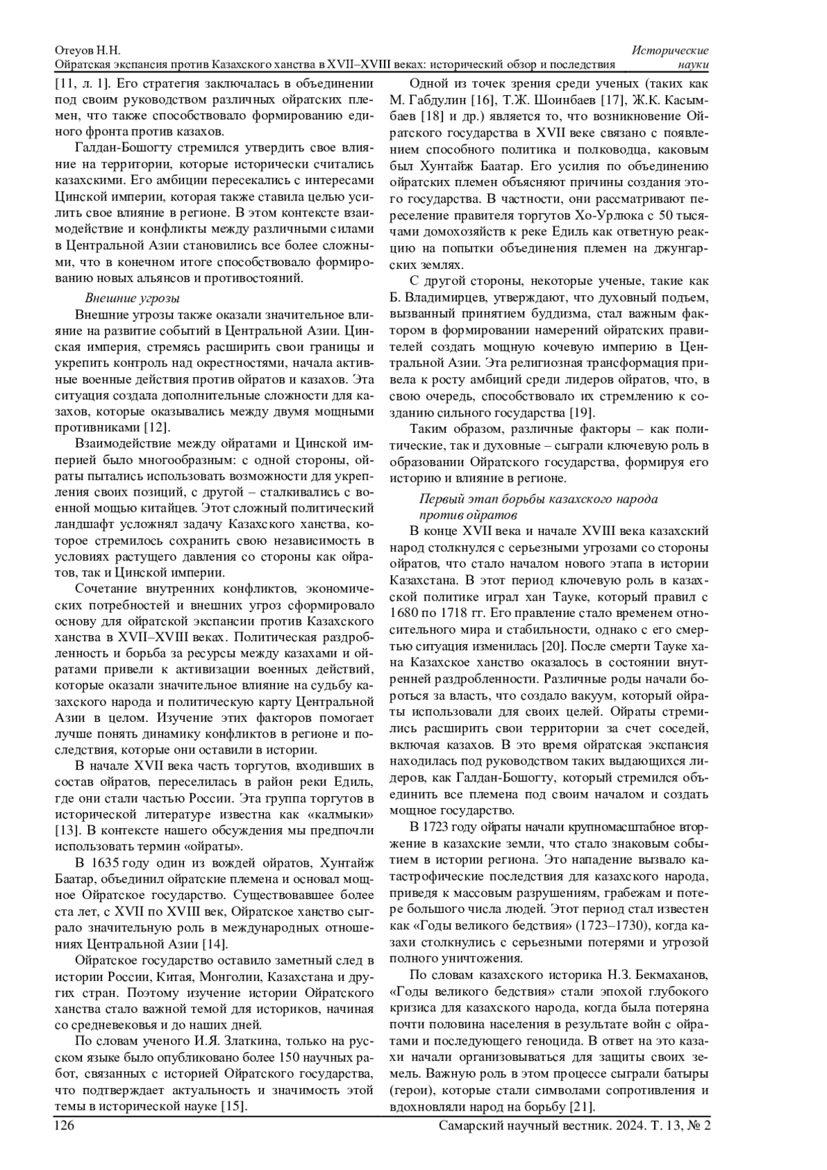 Статья посвящена всестороннему анализу ойратской экспансии против Казахского ханства в XVII-XVIII веках, одного из наиболее значимых и драматических периодов в истории Центральной Азии. Исследование охватывает ключевые этапы конфликта, начиная с первых вторжений ойратов на казахские земли и заканчивая кульминацией в виде массовых миграций и демографических потерь казахского населения в период «Актабан шубырынды». В статье детально рассматриваются причины, стоявшие за агрессивной политикой ойратских правителей, включая внутренние факторы, такие как политическая раздробленность Казахского ханства, и внешние, такие как экономические и военные амбиции джунгарских ханов. Автор уделяет особое внимание анализу ключевых сражений и военных кампаний, оказавших решающее влияние на исход противостояния. В статье исследуются последствия ойратской агрессии, в том числе демографические потери, политическая дестабилизация и изменение геополитического баланса в регионе. Освещаются также долгосрочные эффекты этих событий, включая формирование новых межгосударственных союзов и стратегических альянсов, которые предопределили дальнейшее развитие Центральной Азии. В результате исследования автор приходит к выводу, что ойратская экспансия сыграла ключевую роль в формировании политической и социальной структуры региона, оказав глубокое воздействие на дальнейшую историю Казахского ханства и его соседей.