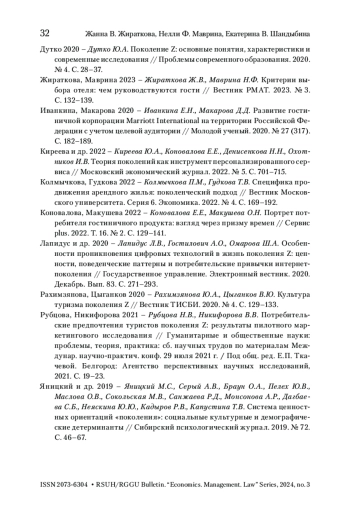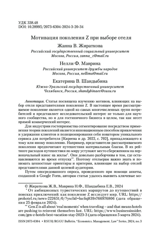 ЖИРАТКОВА Ж. В., МАВРИНА Н. Ф., ШАНДЫБИНА Е. В. МОТИВАЦИЯ ПОКОЛЕНИЯ Z ПРИ ВЫБОРЕ ОТЕЛЯ // ВЕСТНИК РГГУ. СЕРИЯ: ЭКОНОМИКА. УПРАВЛЕНИЕ. ПРАВО. 2024. № 3