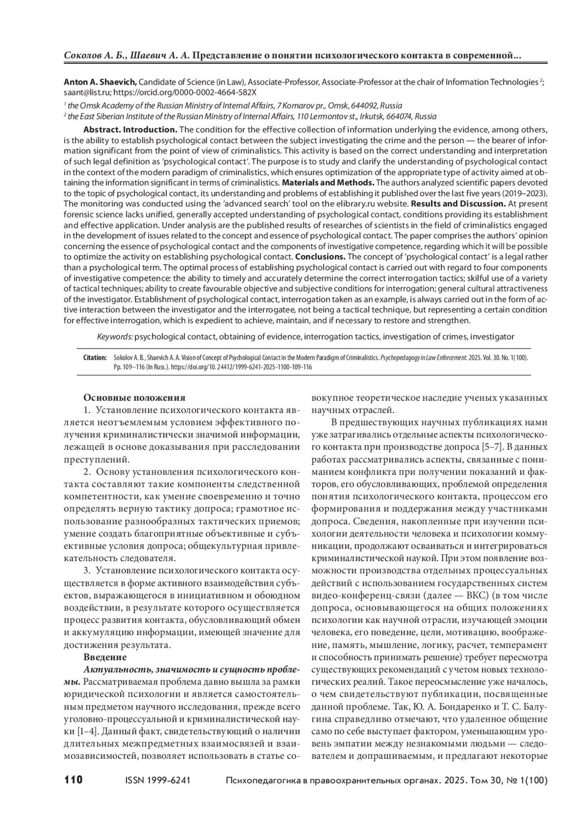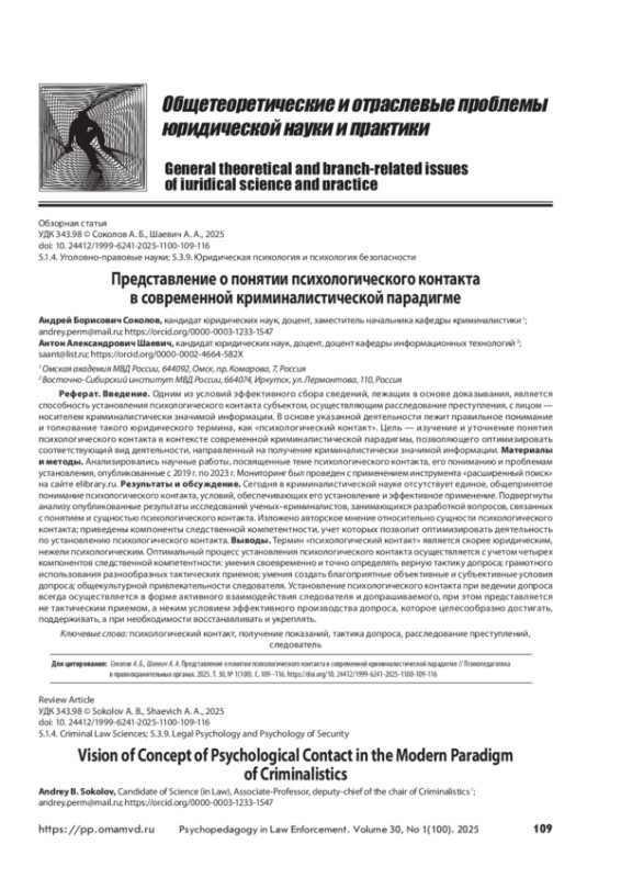 Одним из условий эффективного сбора сведений, лежащих в основе доказывания, является способность установления психологического контакта субъектом, осуществляющим расследование преступления, с лицом — носителем криминалистически значимой информации. В основе указанной деятельности лежит правильное понимание и толкование такого юридического термина, как «психологический контакт». Цель — изучение и уточнение понятия психологического контакта в контексте современной криминалистической парадигмы, позволяющего оптимизировать соответствующий вид деятельности, направленный на получение криминалистически значимой информации. Материалы и методы. Анализировались научные работы, посвященные теме психологического контакта, его пониманию и проблемам установления, опубликованные с 2019 г. по 2023 г. Мониторинг был проведен с применением инструмента «расширенный поиск» на сайте elibrary. ru. Результаты и обсуждение. Сегодня в криминалистической науке отсутствует единое, общепринятое понимание психологического контакта, условий, обеспечивающих его установление и эффективное применение. Подвергнуты анализу опубликованные результаты исследований ученых–криминалистов, занимающихся разработкой вопросов, связанных с понятием и сущностью психологического контакта. Изложено авторское мнение относительно сущности психологического контакта; приведены компоненты следственной компетентности, учет которых позволит оптимизировать деятельность по установлению психологического контакта. Выводы. Термин «психологический контакт» является скорее юридическим, нежели психологическим. Оптимальный процесс установления психологического контакта осуществляется с учетом четырех компонентов следственной компетентности: умения своевременно и точно определять верную тактику допроса; грамотного использования разнообразных тактических приемов; умения создать благоприятные объективные и субъективные условия допроса; общекультурной привлекательности следователя. Установление психологического контакта при ведении допроса всегда осуществляется в форме активного взаимодействия следователя и допрашиваемого, при этом представляется не тактическим приемом, а неким условием эффективного производства допроса, которое целесообразно достигать, поддерживать, а при необходимости восстанавливать и укреплять.