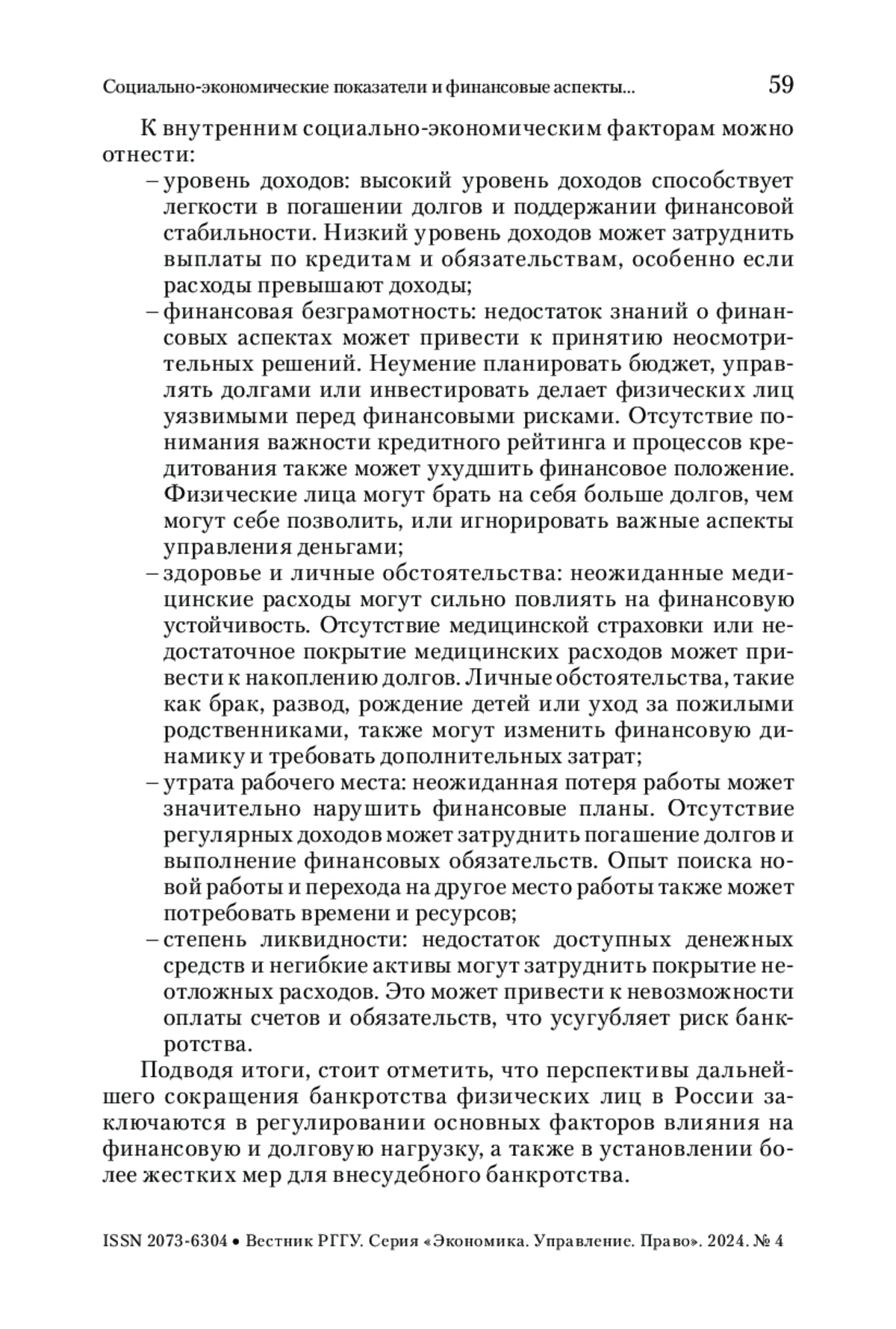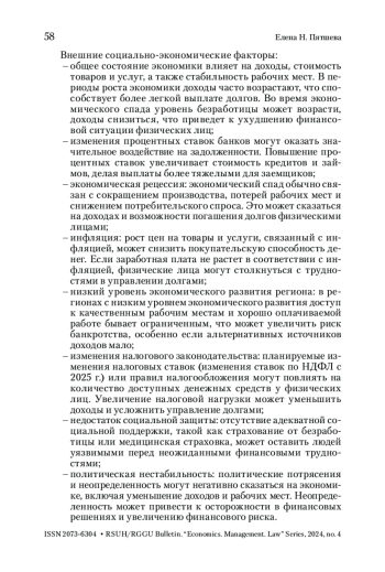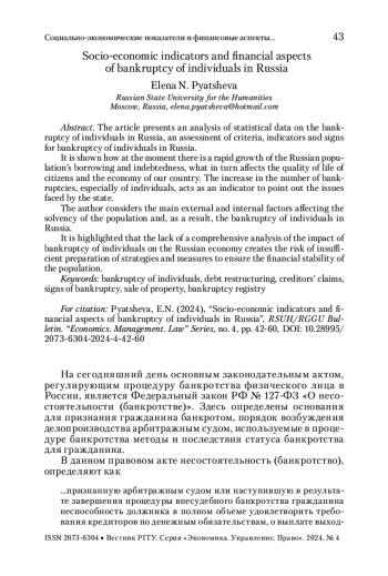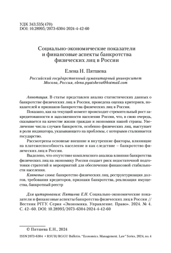 В статье представлен анализ статистических данных о банкротстве физических лиц в России, проведена оценка критериев, показателей и признаков банкротства физических лиц в России. Показано, как на текущий момент происходит стремительный рост закредитованности и задолженности населения России, что, в свою очередь, сказывается на качестве жизни граждан и экономики нашей страны. Увеличение числа случаев банкротств, особенно физических лиц, выступает в роли индикатора, указывающего на проблемы, с которыми сталкивается государство. Рассмотрены основные внешние и внутренние факторы, влияющие на платежеспособность население и как следствие – банкротство физических лиц в России. Выделено, что отсутствие комплексного анализа влияния банкротства физических лиц на экономику России создает риск недостаточной подготовки стратегий и мероприятий для обеспечения финансовой стабильности населения.