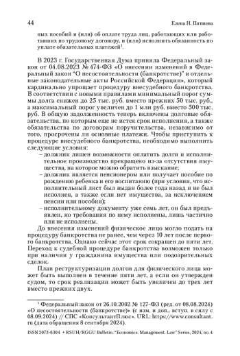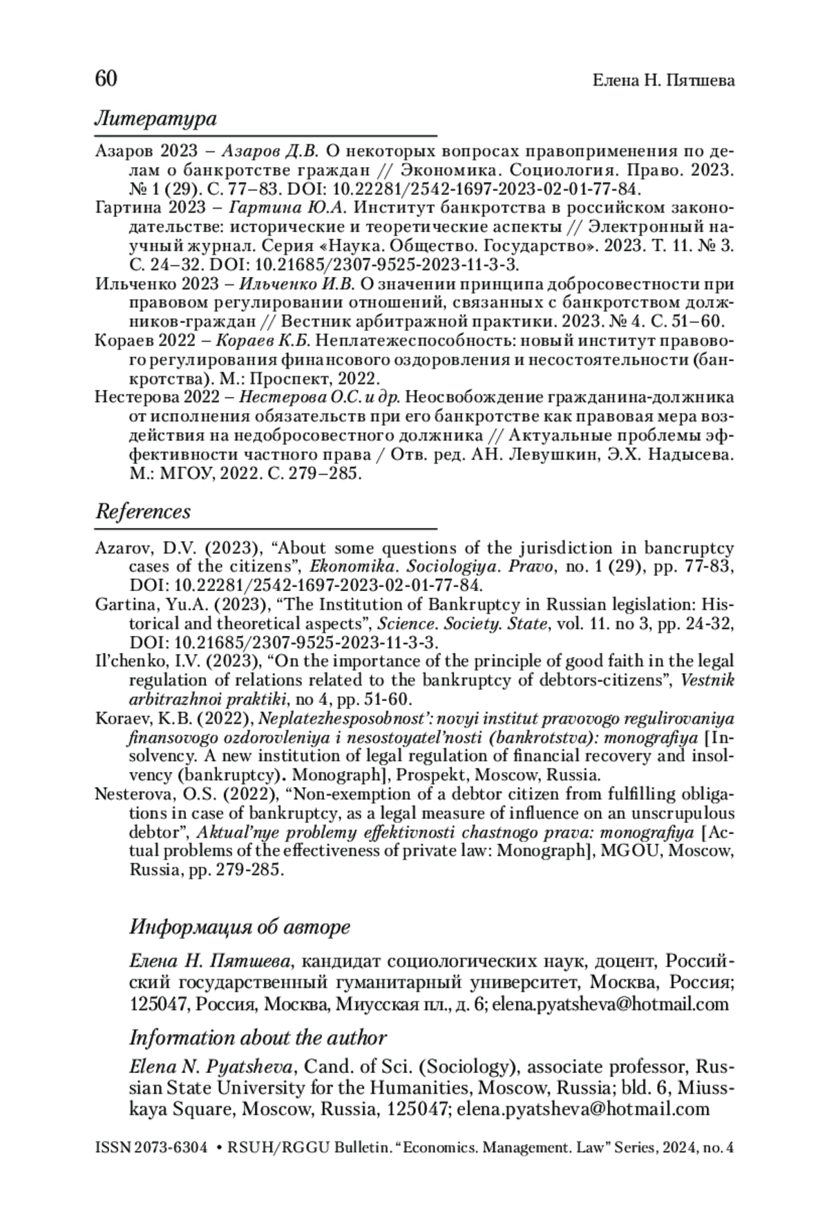 1. Азаров 2023 - Азаров Д.В. О некоторых вопросах правоприменения по делам о банкротстве граждан // Экономика. Социология. Право. 2023. № 1 (29). С. 77-83. https://doi.org/10.22281/2542-1697-2023-02-01-77-84.