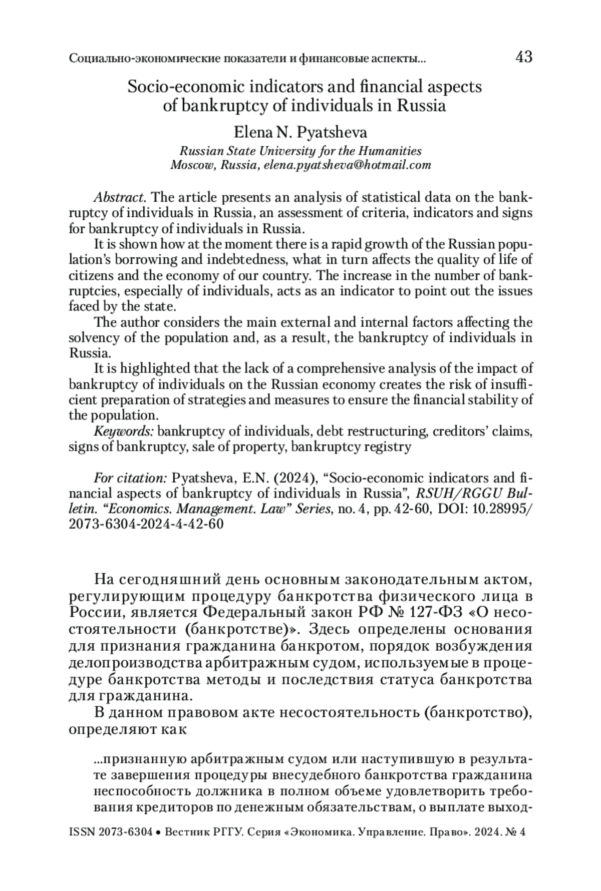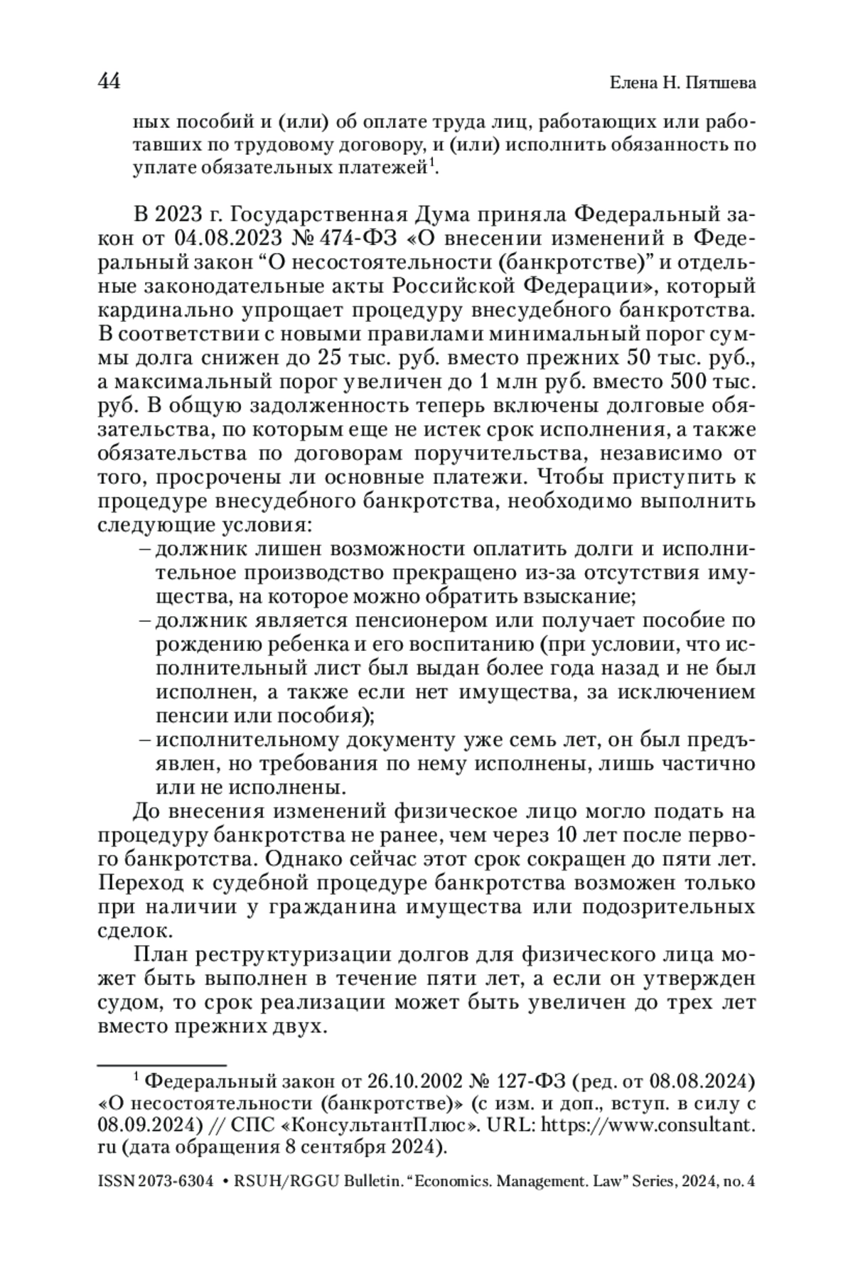 2. Гартина 2023 - Гартина Ю.А. Институт банкротства в российском законодательстве: исторические и теоретические аспекты // Электронный научный журнал. Серия «Наука. Общество. Государство». 2023. Т. 11. № 3. С. 24-32. https://doi.org/: 10.21685/2307-9525-2023-11-3-3.