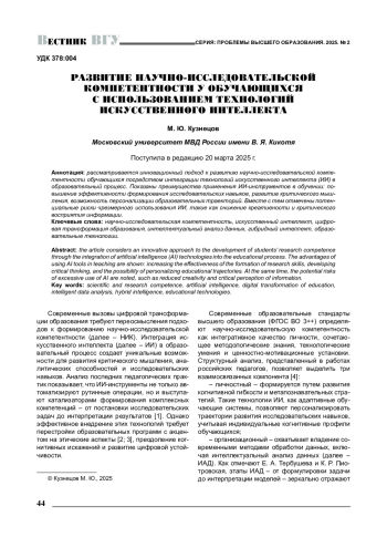 Рассматривается инновационный подход к развитию научно-исследовательской компетентности обучающихся посредством интеграции технологий искусственного интеллекта (ИИ) в образовательный процесс. Показаны преимущества применения ИИ-инструментов в обучении: повышение эффективности формирования исследовательских навыков, развитие критического мышления, возможность персонализации образовательных траекторий. Вместе с тем отмечены потенциальные риски чрезмерного использования ИИ, такие как снижение креативности и критического восприятия информации.