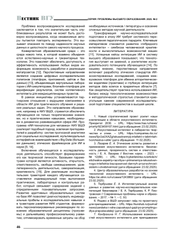 13. Ерофеева М. А. К вопросу об использовании искусственного интеллекта в научно-исследовательской деятельности обучающихся (адъюнктов / аспирантов, студентов) / М. А. Ерофеева, М. Ю. Кузнецов, Б. Р. Кодиров // Вестник Воронежского государственного университета. Серия: Проблемы высшего образования. - 2024. - № 3. - С. 19-22. EDN: EOTZBB